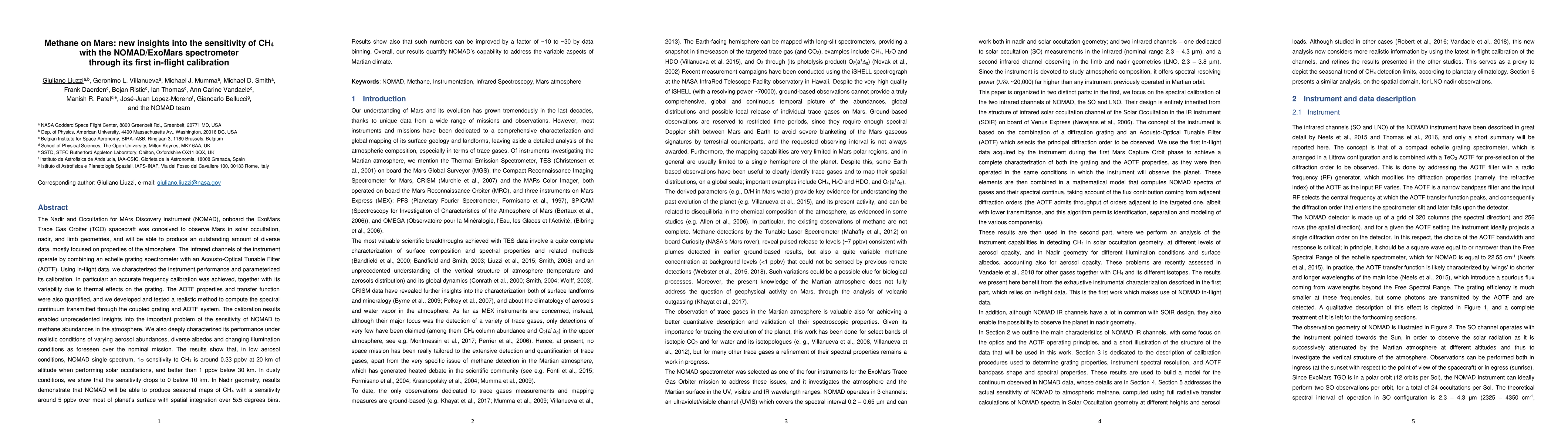 The NOMAD/ExoMars spectrometer has been calibrated in-flight, achieving high sensitivity to methane (CH4) in Mars' atmosphere, with a 1-sigma sensitivity of 0.33 ppbv at 20 km in low aerosol conditions. Under dusty conditions, sensitivity drops significantly, but NOMAD can still produce seasonal methane maps with a 5 ppbv sensitivity.