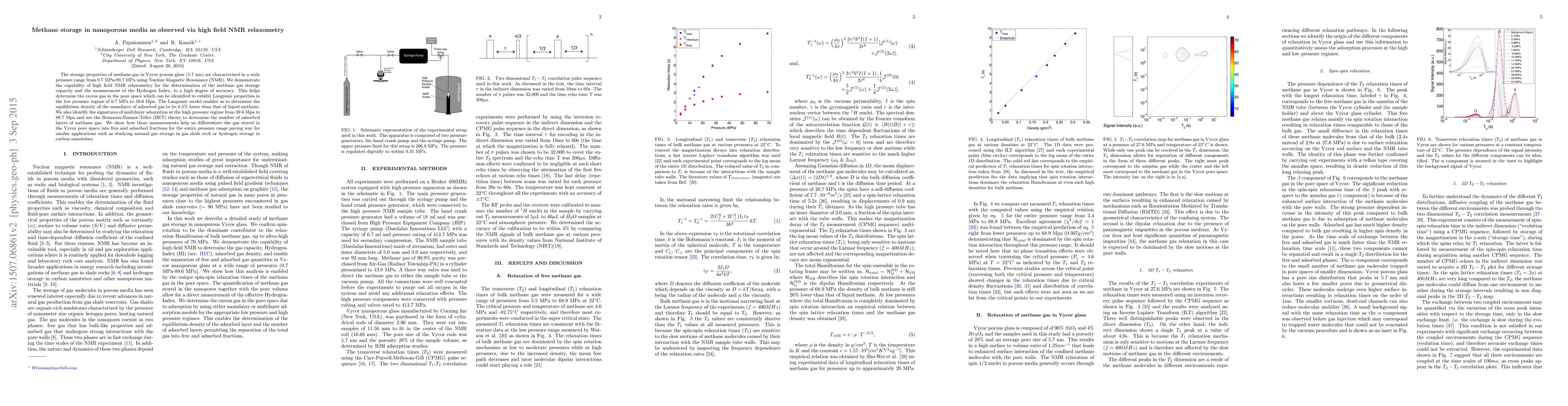 This study characterizes methane gas storage in Vycor porous glass using high field NMR relaxometry, revealing the gas storage capacity and identifying Langmuir and multilayer adsorption properties. The research differentiates free and adsorbed gas fractions across a wide pressure range, providing insights for natural gas and hydrogen storage applications.