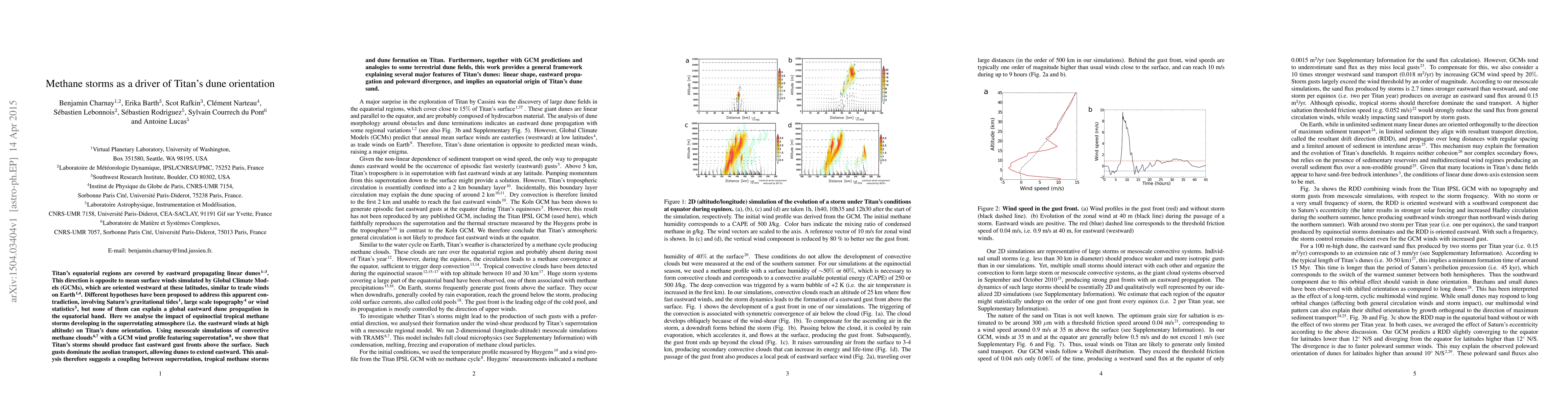 This paper proposes that methane storms in Titan's superrotating atmosphere generate eastward gust fronts that drive the eastward propagation of equatorial linear dunes, resolving the contradiction between dune orientation and surface wind direction. The study uses mesoscale simulations to demonstrate the influence of these storms on dune formation.