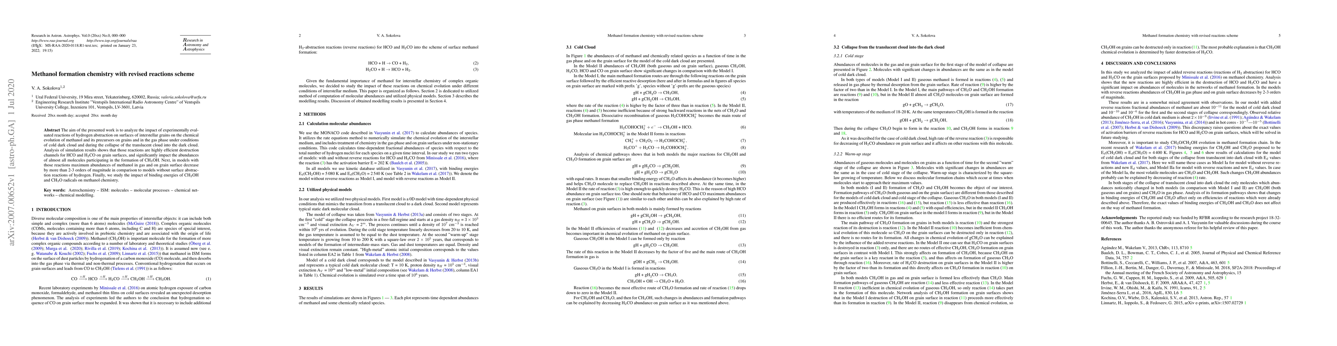 The aim of the presented work is to analyze the impact of experimentally evaluated reactions of hydrogen abstraction on surfaces of interstellar grains on the chemical evolution of methanol and its precursors on grains and in the gas phase under conditions of cold dark cloud and during the collapse of the translucent cloud into the dark cloud. Analysis of simulation results shows that those reactions are highly efficient destruction channels for HCO and H2CO on grain surfaces, and significantly impact the abundances of almost all molecules participating in the formation of CH3OH. Next, in models with those reactions maximum abundances of methanol in gas and on grain surface decrease by more than 2-3 orders of magnitude in comparison to models without surface abstraction reactions of hydrogen. Finally, we study the impact of binding energies of CH2OH and CH3O radicals on methanol chemistry.