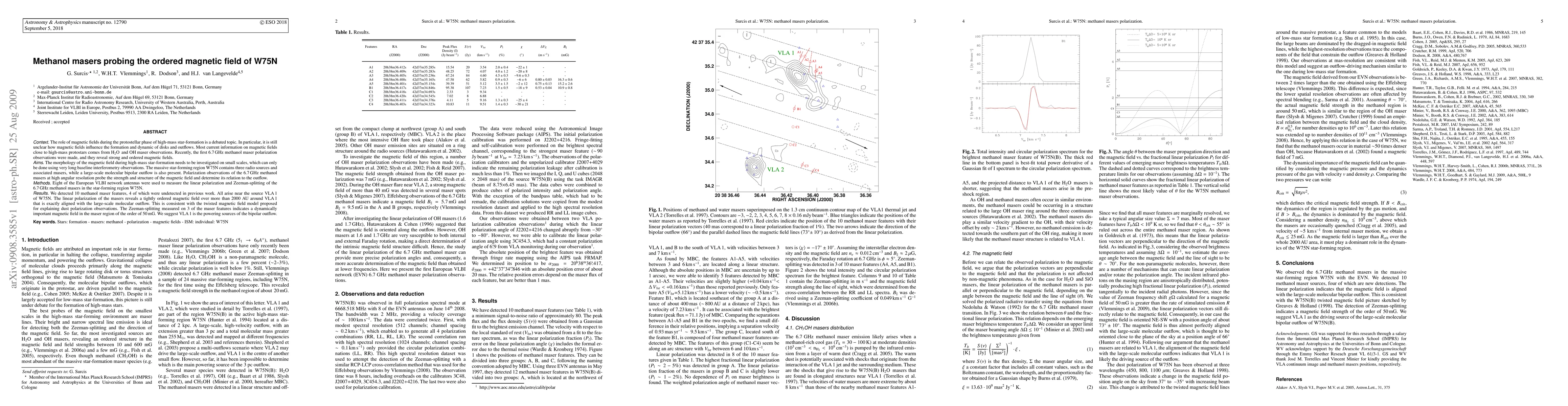 The role of magnetic fields during the protostellar phase of high-mass star-formation is a debated topic. In particular, it is still unclear how magnetic fields influence the formation and dynamic of disks and outflows. Most current information on magnetic fields close to high-mass protostars comes from H2O and OH maser observations. Recently, the first 6.7 GHz methanol maser polarization observations were made, and they reveal strong and ordered magnetic fields. The morphology of the magnetic field during high-mass star-formation needs to be investigated on small scales, which can only be done using very long baseline interferometry observations. The massive star-forming regionW75N contains three radio sources and associated masers, while a large-scale molecular bipolar outflow is also present. Polarization observations of the 6.7 GHz methanol masers at high angular resolution probe the strength and structure of the magnetic field and determine its relation to the outflow. Eight of the European VLBI network antennas were used to measure the linear polarization and Zeeman-splitting of the 6.7 GHz methanol masers in the star-forming region W75N. We detected 10 methanol maser features, 4 of which were undetected in previous work. All arise near the source VLA1 of W75N. The linear polarization of the masers reveals a tightly ordered magnetic field over more than 2000 AU around VLA1 that is exactly aligned with the large-scale molecular outflow. This is consistent with the twisted magnetic field model proposed for explaining dust polarization observations. The Zeeman-splitting measured on 3 of the maser features indicates a dynamically important magnetic field in the maser region of the order of 50mG. We suggest VLA1 is the powering sources of the bipolar outflow.