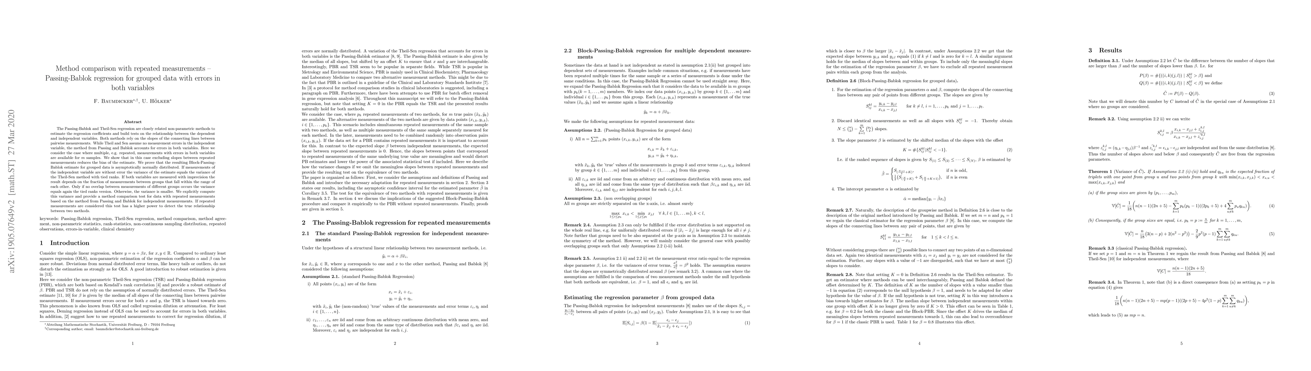 The Passing-Bablok and Theil-Sen regression are closely related non-parametric methods to estimate the regression coefficients and build tests on the relationship between the dependent and independent variables. Both methods rely on the slopes of the connecting lines between pairwise measurements. While Theil and Sen assume no measurement errors in the independent variable, the method from Passing and Bablok accounts for errors in both variables. Here we consider the case where multiple, e.g. repeated, measurements with errors in both variables are available for m samples. We show that in this case the slopes between repeated measurements need to be excluded to obtain an unbiased estimate. We prove that the resulting Block-Passing-Bablok estimate for grouped data is asymptotically normally distributed. If measurements of the independent variable are without error the variance of the estimate equals the variance of the Theil-Sen method with tied ranks. If both variables are measured with imprecision the result depends on the fraction of measurements between groups that fall within the range of each other. Only if no overlap between measurements of different groups occurs the variance equals again the tied ranks version. Otherwise, the variance is smaller. We explicitly compute this variance and provide a method comparison test for data with repeated measurements based on the method from Passing and Bablok for independent measurements. If repeated measurements are considered this test has a higher power to detect the true relationship between two methods.
