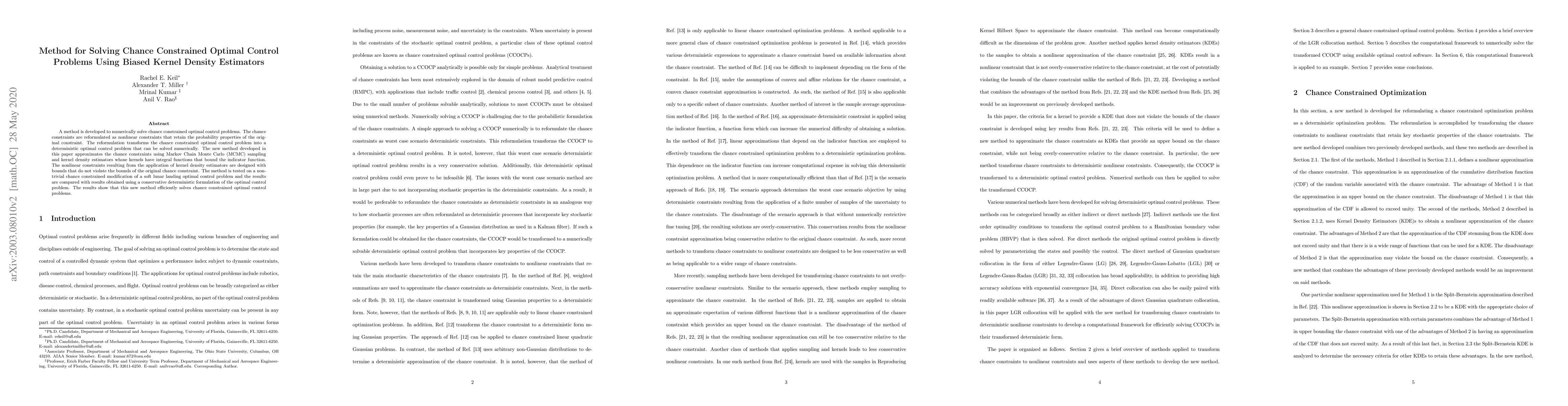 This paper presents a method for solving chance constrained optimal control problems by reformulating the constraints using biased kernel density estimators and MCMC sampling. The method efficiently transforms the problem into a deterministic form, which is then tested on a lunar landing scenario, demonstrating its effectiveness compared to conservative deterministic approaches.