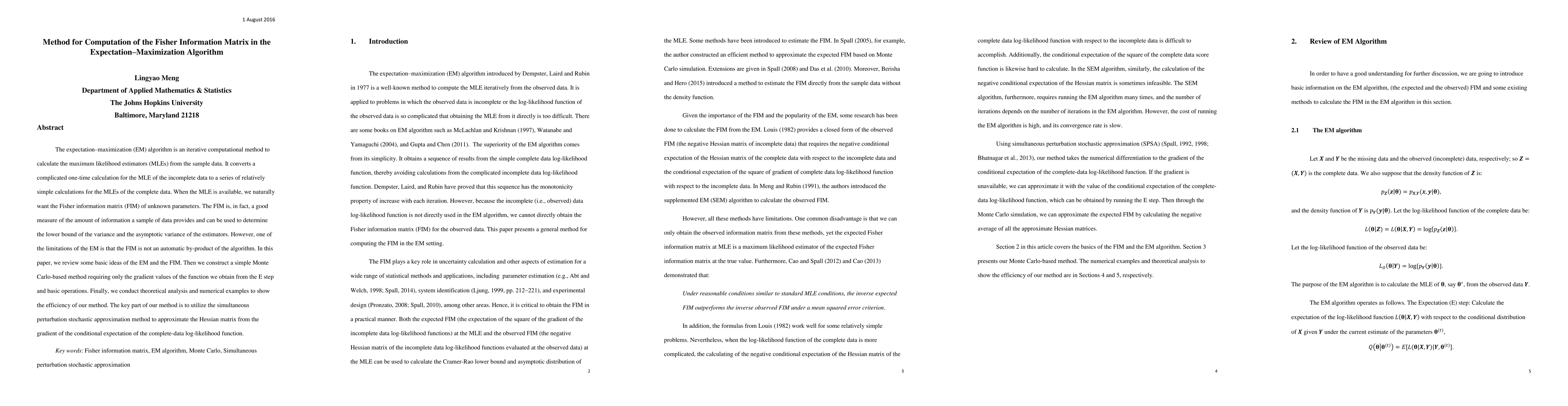This paper proposes a Monte Carlo-based method to efficiently compute the Fisher Information Matrix in the Expectation-Maximization Algorithm, enabling automatic derivation of its value without additional computational overhead.