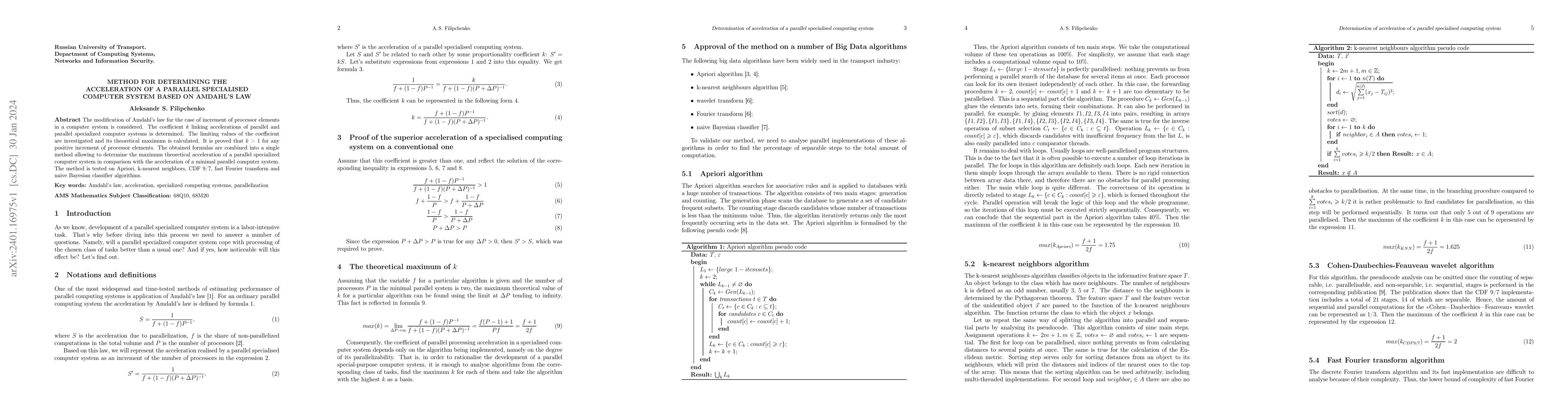 This paper modifies Amdahl's law to determine the acceleration of parallel specialized computer systems, establishing a coefficient $k$ that links the accelerations of parallel and specialized systems. The method is tested on various algorithms to determine the maximum theoretical acceleration.
