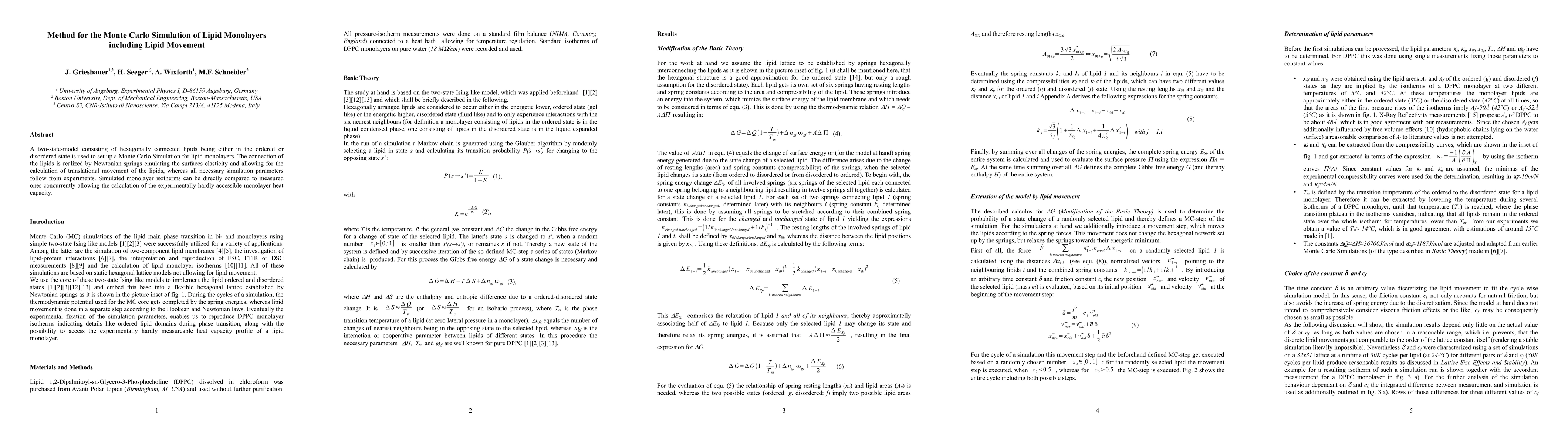 A two-state-model consisting of hexagonally connected lipids being either in the ordered or disordered state is used to set up a Monte Carlo Simulation for lipid monolayers. The connection of the lipids is realized by Newtonian springs emulating the surfaces elasticity and allowing for the calculation of translational movement of the lipids, whereas all necessary simulation parameters follow from experiments. Simulated monolayer isotherms can be directly compared to measured ones concurrently allowing the calculation of the experimentally hardly accessible monolayer heat capacity.