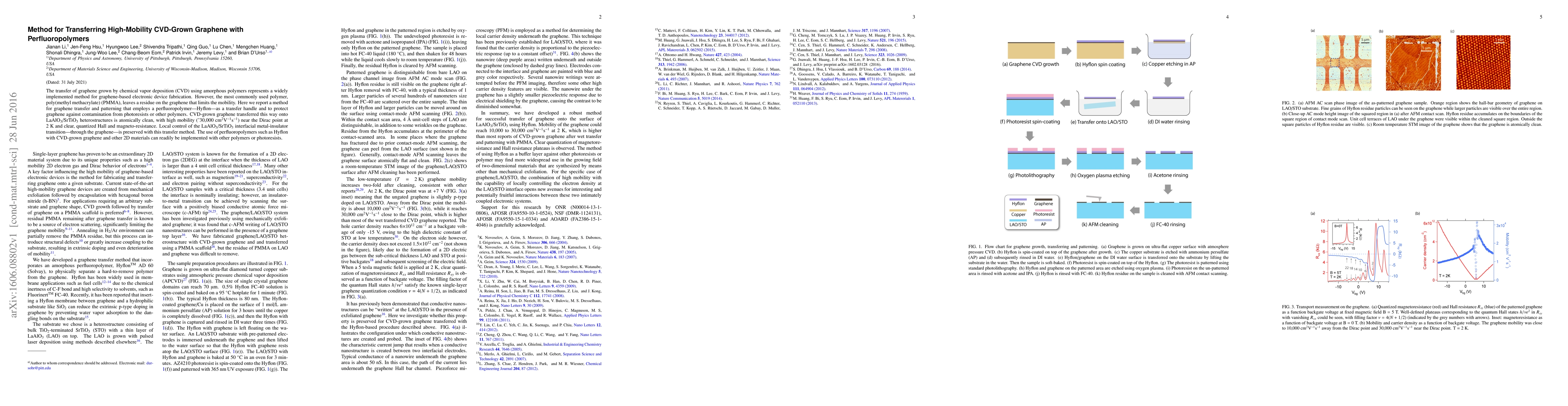 This paper proposes a novel transfer method for high-mobility CVD-grown graphene using Hyflon, a perfluoropolymer, to avoid residues and contamination, achieving clean graphene with high mobility and preserving local control of material properties. The method enables atomically clean graphene transfer onto heterostructures with clear quantum effects.