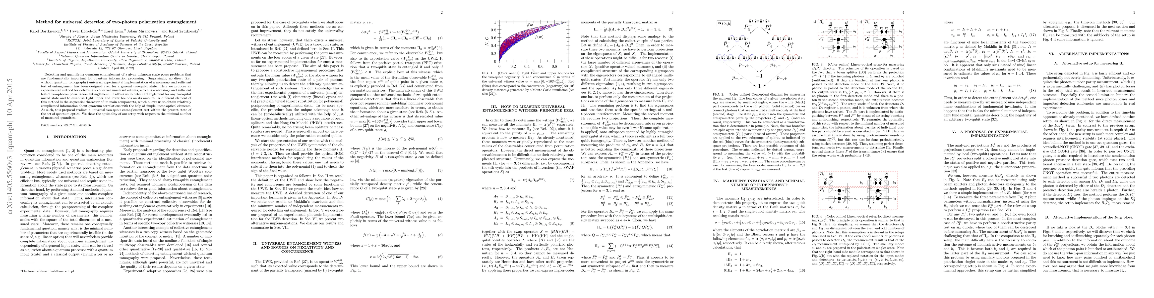 This paper proposes a universal experimental method for detecting two-photon polarization entanglement without the need for quantum tomography, utilizing a collective universal witness. The method employs a sequential approach with simple linear-optical elements to determine entanglement in any two-qubit mixed state, optimizing the number of measured quantities.