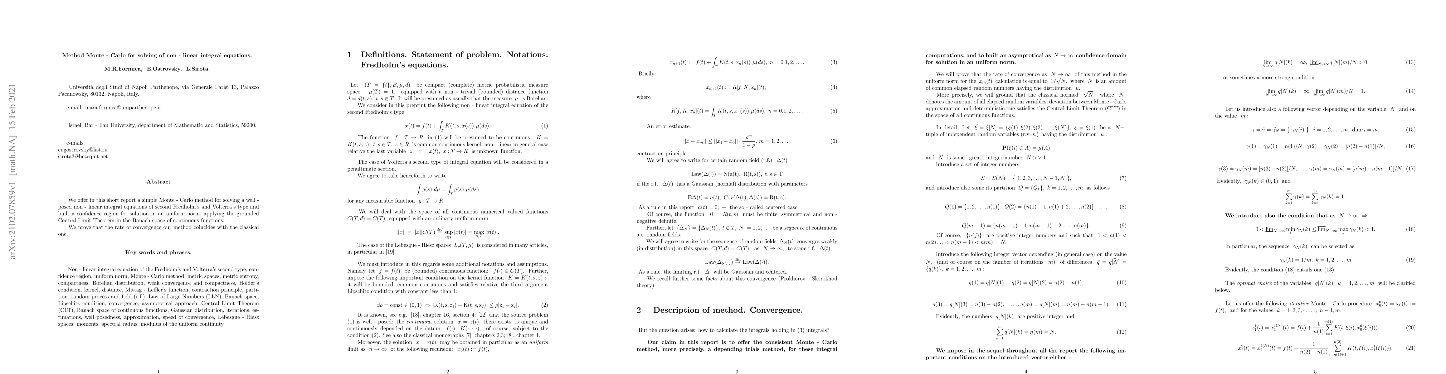 Summary: This paper proposes a Monte-Carlo method for solving non-linear integral equations of second Fredholm and Volterra types, establishing a confidence region for the solution and proving that its convergence rate matches the classical method. The approach leverages the Central Limit Theorem in the Banach space of continuous functions.