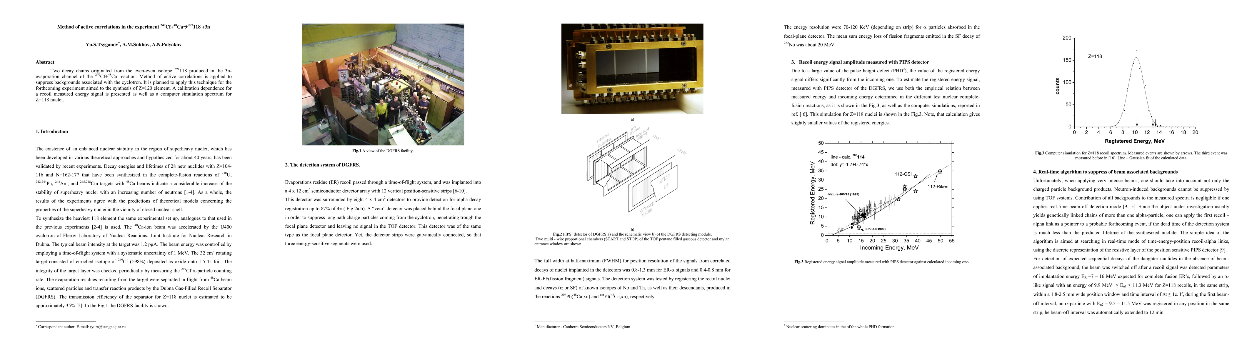 Two decay chains originated from the even-even isotope 294118 produced in the 3n-evaporation channel of the 249Cf+48Ca reaction. Method of active correlations is applied to suppress backgrounds associated with the cyclotron. It is planned to apply this technique for the forthcoming experiment aimed to the synthesis of Z=120 element. A calibration dependence for a recoil measured energy signal is presented as well as a computer simulation spectrum for Z=118 nuclei.