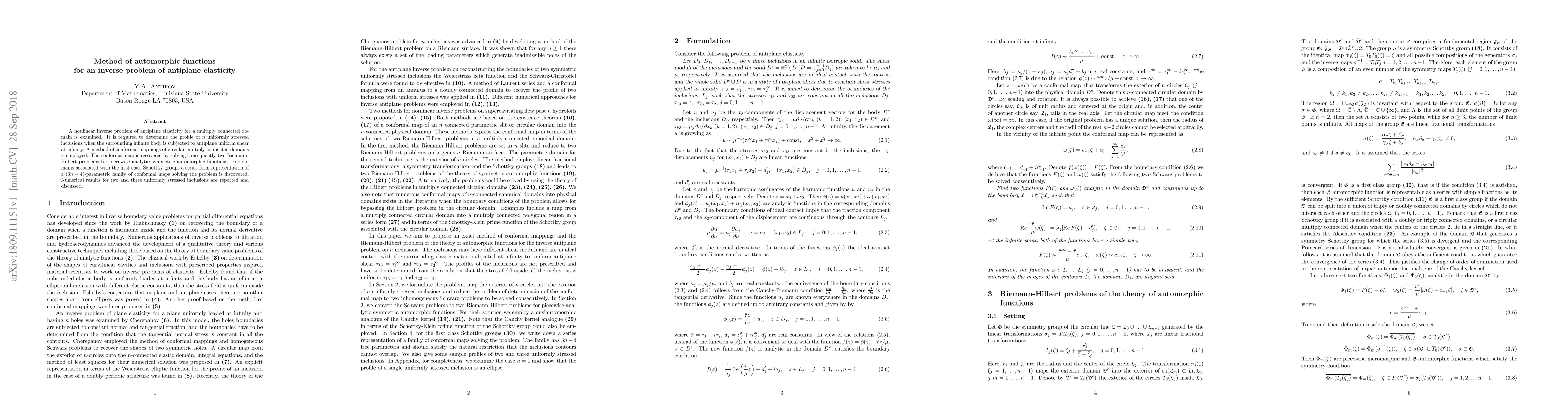 This paper proposes a method using conformal mappings to solve a nonlinear inverse problem in antiplane elasticity, focusing on determining the profile of uniformly stressed inclusions in a multiply connected domain under antiplane shear. It employs a series-form representation for conformal maps associated with Schottky groups and reports numerical results for two and three inclusions.