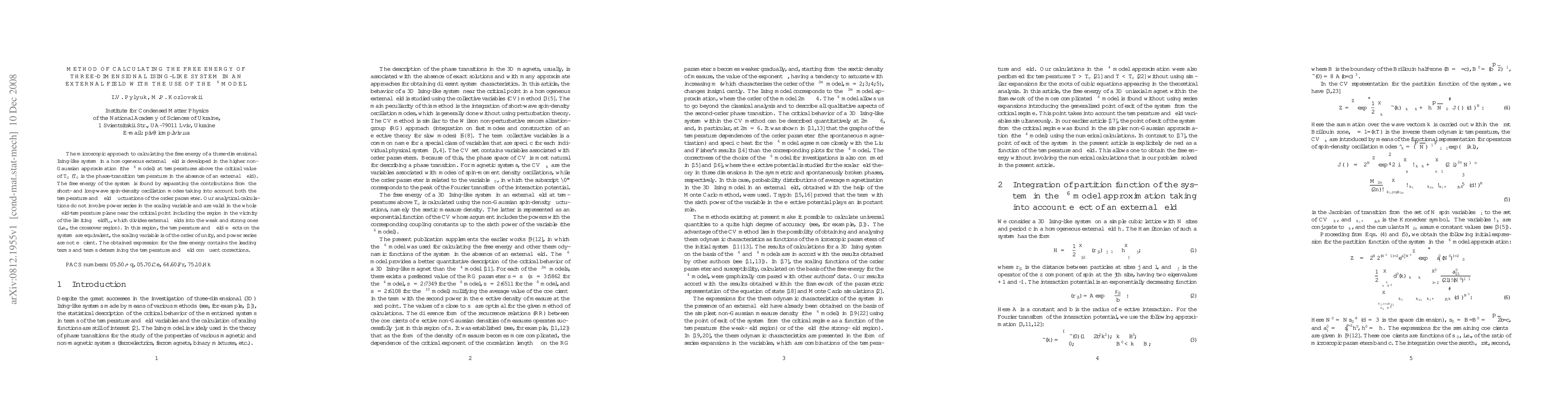 The microscopic approach to calculating the free energy of a three-dimensional Ising-like system in a homogeneous external field is developed in the higher non-Gaussian approximation (the $\rho^6$ model) at temperatures above the critical value of $T_c$ ($T_c$ is the phase-transition temperature in the absence of an external field). The free energy of the system is found by separating the contributions from the short- and long-wave spin-density oscillation modes taking into account both the temperature and field fluctuations of the order parameter. Our analytical calculations do not involve power series in the scaling variable and are valid in the whole field-temperature plane near the critical point including the region in the vicinity of the limiting field $\tilde h_c$, which divides external fields into the weak and strong ones (i.e., the crossover region). In this region, the temperature and field effects on the system are equivalent, the scaling variable is of the order of unity, and power series are not efficient. The obtained expression for the free energy contains the leading terms and terms determining the temperature and field confluent corrections.