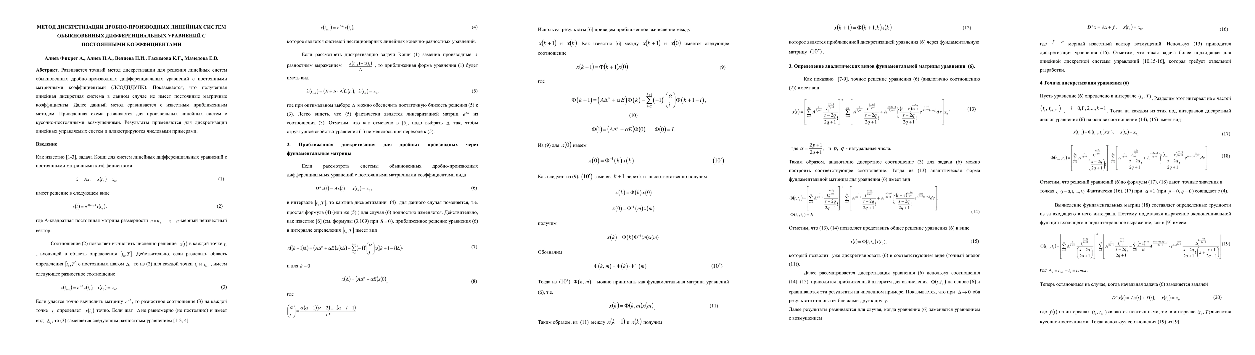 An exact discretization method is being developed for solving linear systems of ordinary fractional-derivative differential equations with constant matrix coefficients (LSOFDDECMC). It is shown that the obtained linear discrete system in this case does not have constant matrix coefficients. Further, this method is compared with the known approximate method. The above scheme is developed for arbitrary linear systems with piecewise constant perturbations. The results are applied to the discretization of linear controlled systems and are illustrated with numerical examples.