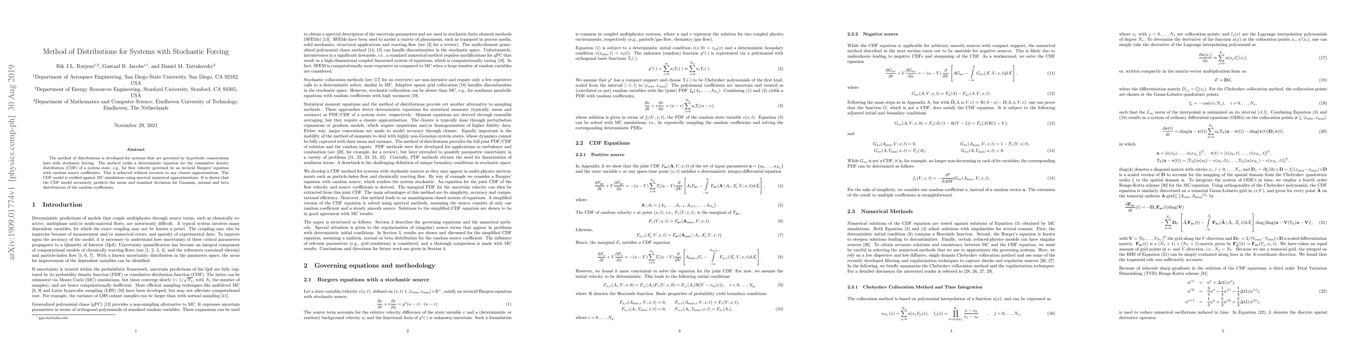 This paper develops a distribution method for systems with stochastic forcing governed by hyperbolic conservation laws, yielding a deterministic equation for the cumulative density distribution without closure approximations. The proposed CDF model is validated against Monte Carlo simulations, showing accurate predictions of mean and standard deviation for various random coefficient distributions.