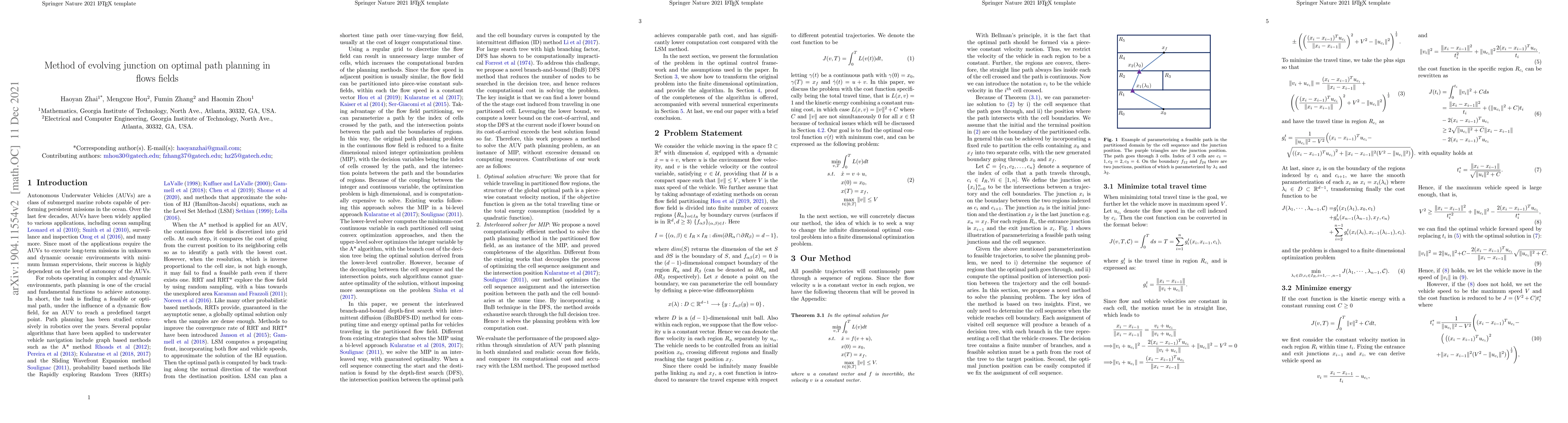 A new algorithm using evolving junctions is proposed to solve optimal path planning problems in flow fields with piece-wise constant flow fields. The algorithm transforms the infinite dimensional problem into a finite one and demonstrates its performance through simulation examples.