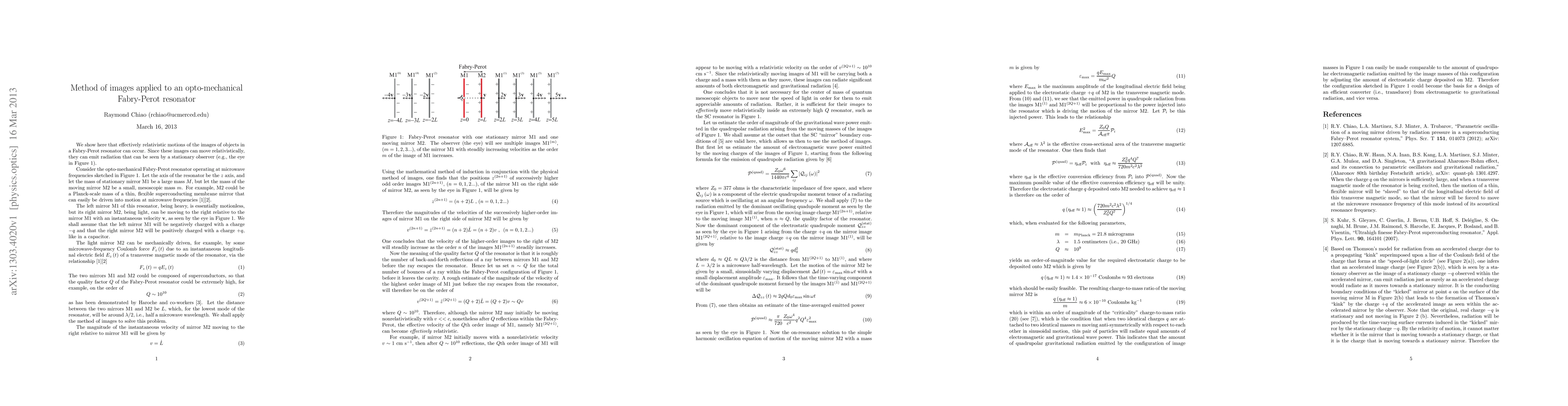 The method of images, when applied to an opto-mechanical Fabry-Perot resonator with a heavy, charged mirror, and a light, charged mirror that can be driven into motion, reveals that the highest order images can move relativistically when the Q of the superconducting resonator is on the order of 10^10. The implications of such relativistic motions of the charge and mass of these images to the emission of electromagnetic and gravitational radiation within the resonator is explored.