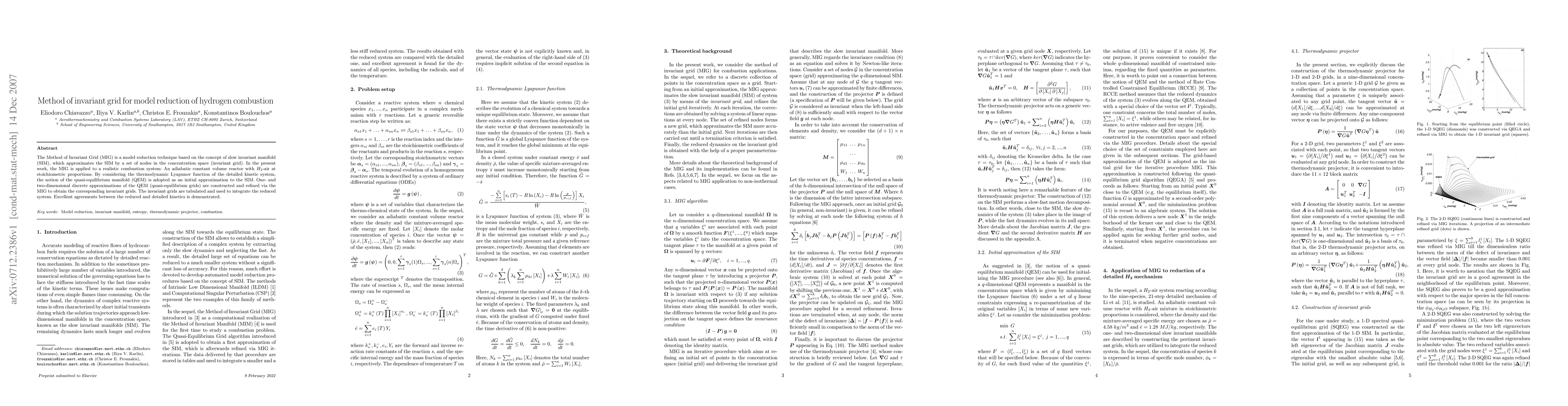 The Method of Invariant Grid (MIG) is a model reduction technique based on the concept of slow invariant manifold (SIM), which approximates the SIM by a set of nodes in the concentration space (invariant grid). In the present work, the MIG is applied to a realistic combustion system: An adiabatic constant volume reactor with H2-air at stoichiometric proportions. By considering the thermodynamic Lyapunov function of the detailed kinetic system, the notion of the quasi-equilibrium manifold (QEM) is adopted as an initial approximation to the SIM. One- and two-dimensional discrete approximations of the QEM (quasi-equilibrium grids) are constructed and refined via the MIG to obtain the corresponding invariant grids. The invariant grids are tabulated and used to integrate the reduced system. Excellent agreements between the reduced and detailed kinetics is demonstrated.