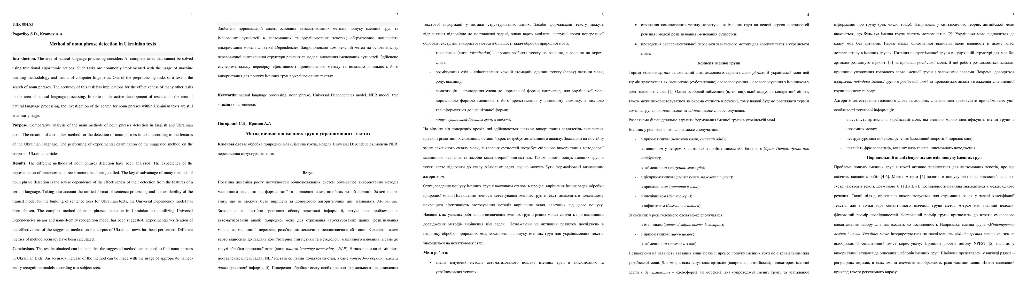 Introduction. The area of natural language processing considers AI-complete tasks that cannot be solved using traditional algorithmic actions. Such tasks are commonly implemented with the usage of machine learning methodology and means of computer linguistics. One of the preprocessing tasks of a text is the search of noun phrases. The accuracy of this task has implications for the effectiveness of many other tasks in the area of natural language processing. In spite of the active development of research in the area of natural language processing, the investigation of the search for noun phrases within Ukrainian texts are still at an early stage. Results. The different methods of noun phrases detection have been analyzed. The expediency of the representation of sentences as a tree structure has been justified. The key disadvantage of many methods of noun phrase detection is the severe dependence of the effectiveness of their detection from the features of a certain language. Taking into account the unified format of sentence processing and the availability of the trained model for the building of sentence trees for Ukrainian texts, the Universal Dependency model has been chosen. The complex method of noun phrases detection in Ukrainian texts utilizing Universal Dependencies means and named-entity recognition model has been suggested. Experimental verification of the effectiveness of the suggested method on the corpus of Ukrainian news has been performed. Different metrics of method accuracy have been calculated. Conclusions. The results obtained can indicate that the suggested method can be used to find noun phrases in Ukrainian texts. An accuracy increase of the method can be made with the usage of appropriate named-entity recognition models according to a subject area.