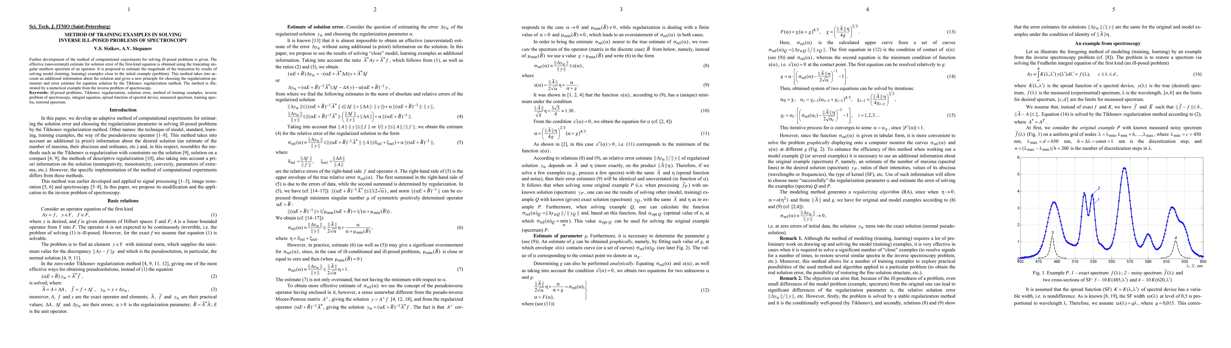This paper develops a computational method for solving ill-posed problems in spectroscopy, utilizing the truncating singular numbers spectrum to obtain an effective solution error estimate. It proposes estimating truncation magnitude through model examples, enhancing the Tikhonov regularization method with additional solution information and a new regularization parameter choice principle.