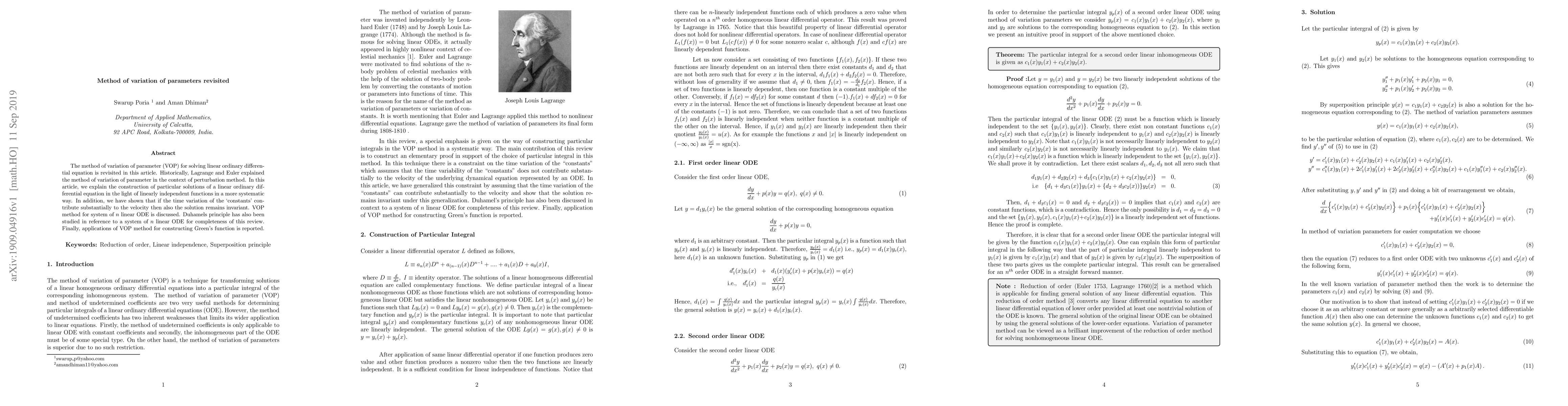 The method of variation of parameter (VOP) for solving linear ordinary differential equation is revisited in this article. Historically, Lagrange and Euler explained the method of variation of parameter in the context of perturbation method. In this article, we explain the construction of particular solutions of a linear ordinary differential equation in the light of linearly independent functions in a more systematic way. In addition, we have shown that if the time variation of the constants contribute substantially to the velocity then also the solution remains invariant. VOP method for system of n linear ODE is discussed. Duhamels principle has also been studied in reference to a system of n linear ODE for completeness of this review. Finally, applications of VOP method for constructing Green's function is reported.