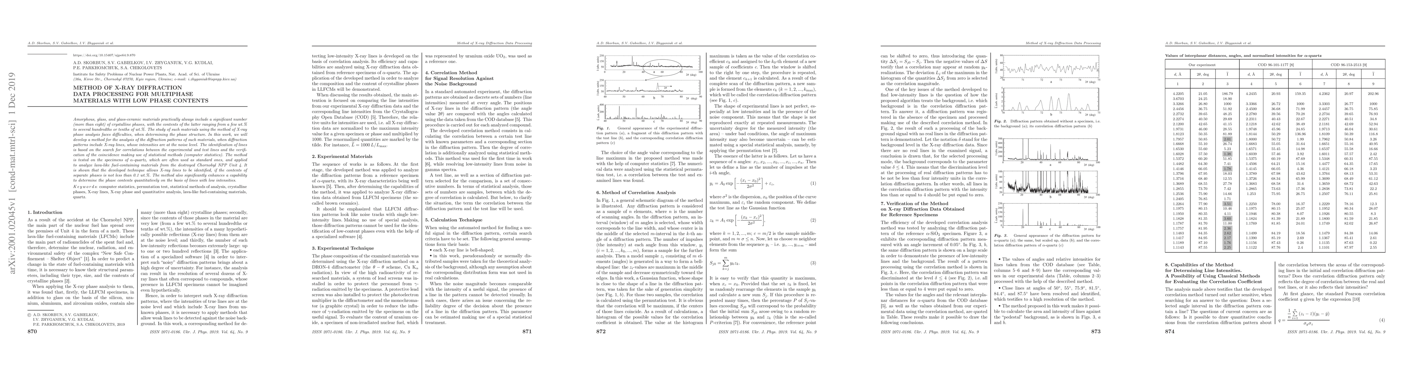 Amorphous, glass, and glass-ceramic materials practically always include a significant number (more than eight) of crystalline phases, with the contents of the latter ranging from a few wt.% to several hundredths or tenths of wt.%. The study of such materials using the method of X-ray phase analysis faces difficulties, when determining the phase structure. In this work, we will develop a method for the analysis of the diffraction patterns of such materials, when diffraction patterns include X-ray lines, whose intensities are at the noise level. The identification of lines is based on the search for correlations between the experimental and test lines and the verification of the coincidence making use of statistical methods (computer statistics). The method is tested on the specimens of a-quartz, which are often used as standard ones, and applied to analyze lava-like fuel-containing materials from the destroyed Chornobyl NPP Unit 4. It is shown that the developed technique allows X-ray lines to be identified, if the contents of separate phases is not less than 0.1 wt.%. The method also significantly enhances a capability to determine the phase contents quantitatively on the basis of lines with low intensities.