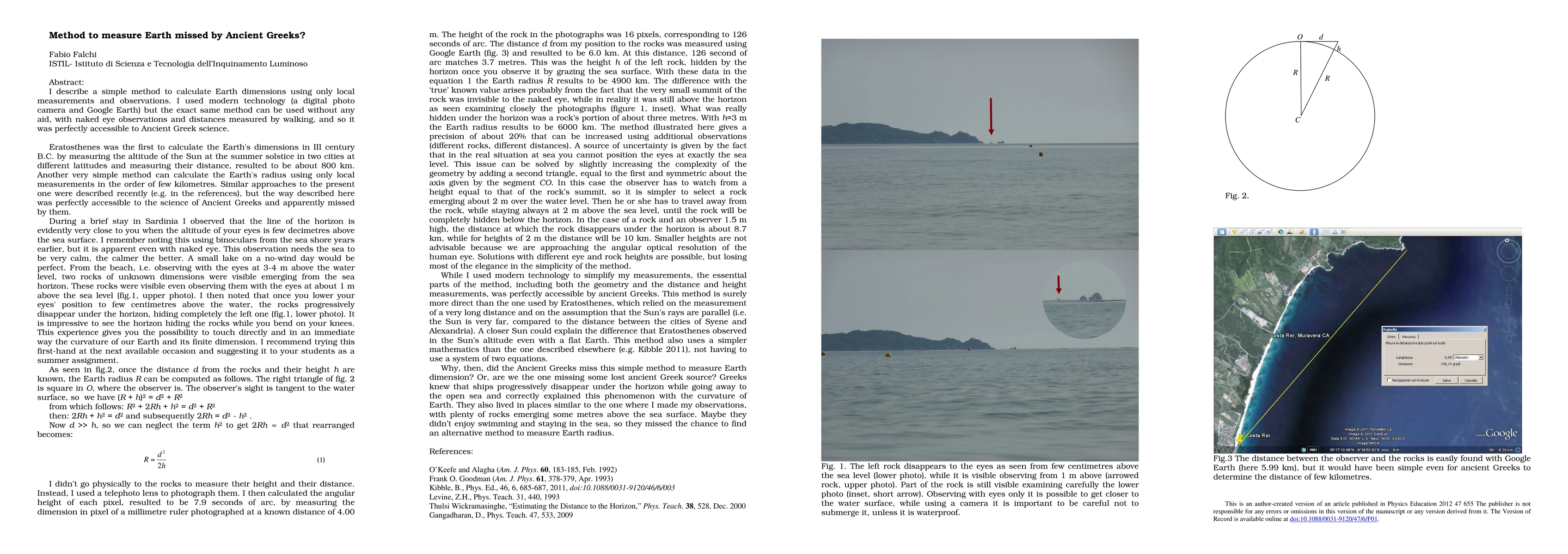 I describe a simple method to calculate Earth dimensions using only local measurements and observations. I used modern technology (a digital photo camera and Google Earth) but the exact same method can be used without any aid, with naked eye observations and distances measured by walking, and so it was perfectly accessible to Ancient Greek science.