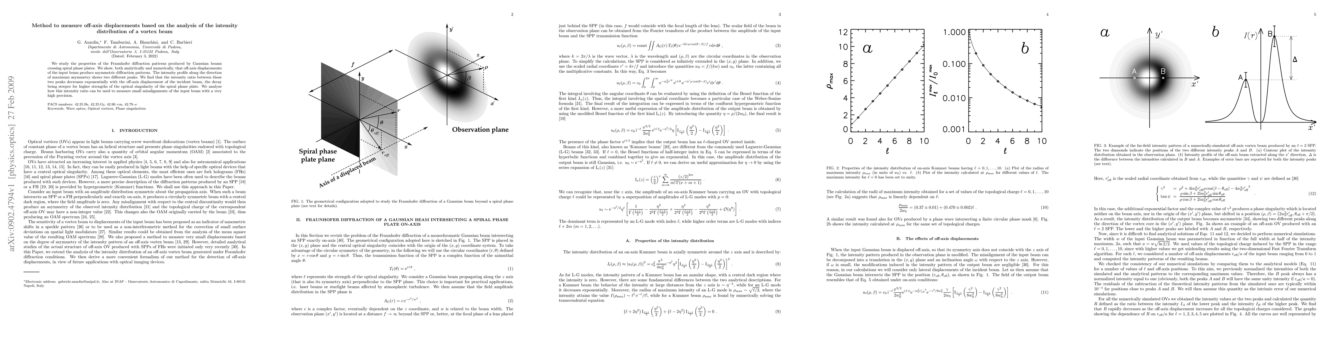 This paper proposes a method to measure off-axis displacements by analyzing the intensity distribution of vortex beams' Fraunhofer diffraction patterns. The study reveals that asymmetric diffraction patterns arise from beam misalignments, with the intensity ratio between two peaks decreasing exponentially with displacement, enabling precise measurement of small misalignments.