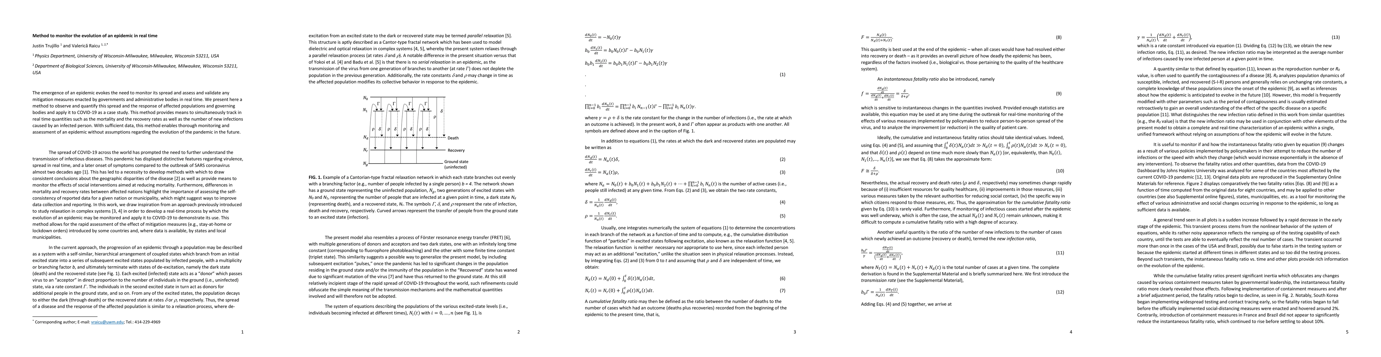 The emergence of an epidemic evokes the need to monitor its spread and assess and validate any mitigation measures enacted by governments and administrative bodies in real time. We present here a method to observe and quantify this spread and the response of affected populations and governing bodies and apply it to COVID-19 as a case study. This method provides means to simultaneously track in real time quantities such as the mortality and the recovery rates as well as the number of new infections caused by an infected person. With sufficient data, this method enables thorough monitoring and assessment of an epidemic without assumptions regarding the evolution of the pandemic in the future.