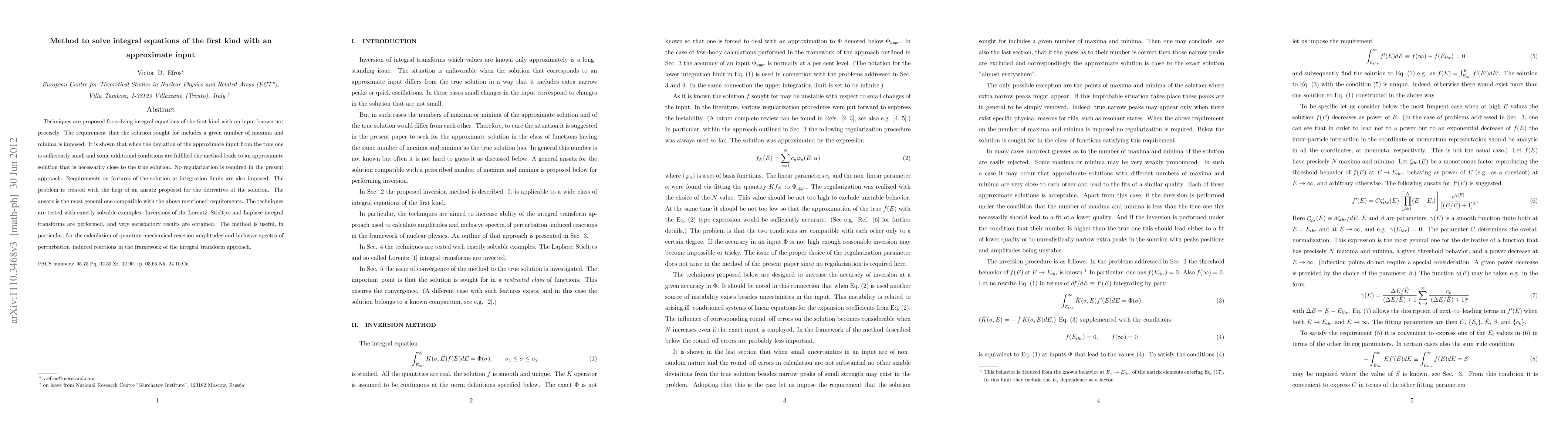 Techniques are proposed for solving integral equations of the first kind with an input known not precisely. The requirement that the solution sought for includes a given number of maxima and minima is imposed. It is shown that when the deviation of the approximate input from the true one is sufficiently small and some additional conditions are fulfilled the method leads to an approximate solution that is necessarily close to the true solution. No regularization is required in the present approach. Requirements on features of the solution at integration limits are also imposed. The problem is treated with the help of an ansatz proposed for the derivative of the solution. The ansatz is the most general one compatible with the above mentioned requirements. The techniques are tested with exactly solvable examples. Inversions of the Lorentz, Stieltjes and Laplace integral transforms are performed, and very satisfactory results are obtained. The method is useful, in particular, for the calculation of quantum-mechanical reaction amplitudes and inclusive spectra of perturbation-induced reactions in the framework of the integral transform approach.