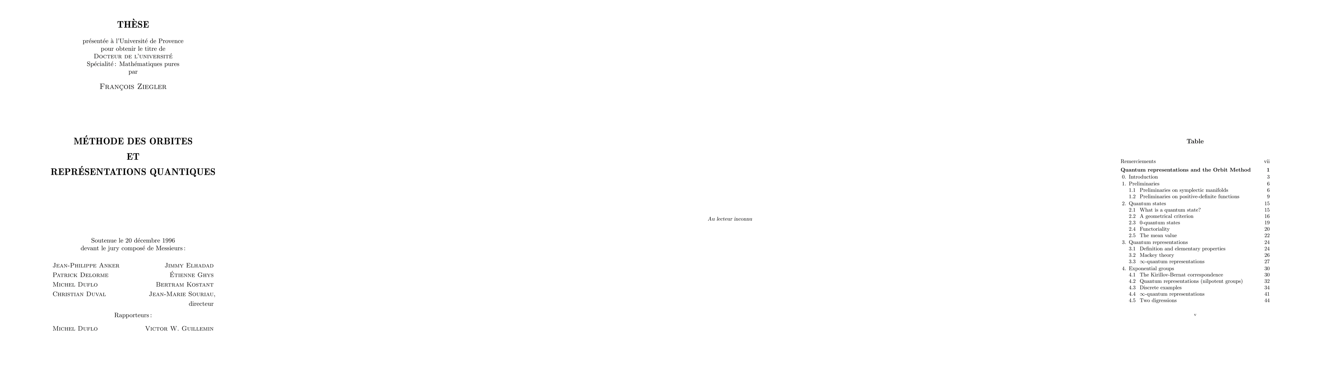 The first part of this thesis studies the notion of a "quantum representation", introduced by J.-M. Souriau in order to provide a polarization-free characterization of the Lie group representations attached to coadjoint orbits. When the group is compact, we show that Souriau's condition does indeed select the Borel-Weil representation within sections of the line bundle over an orbit. At the other extreme, for exponential solvable groups, we give counterexamples to an analogous assertion, but show that a refined condition does select the Kirillov-Bernat representation attached to an orbit. The second part develops the symplectic analogue of Mackey's normal subgroup analysis, using the notion of an induced hamiltonian G-space introduced by Kazhdan, Kostant and Sternberg.