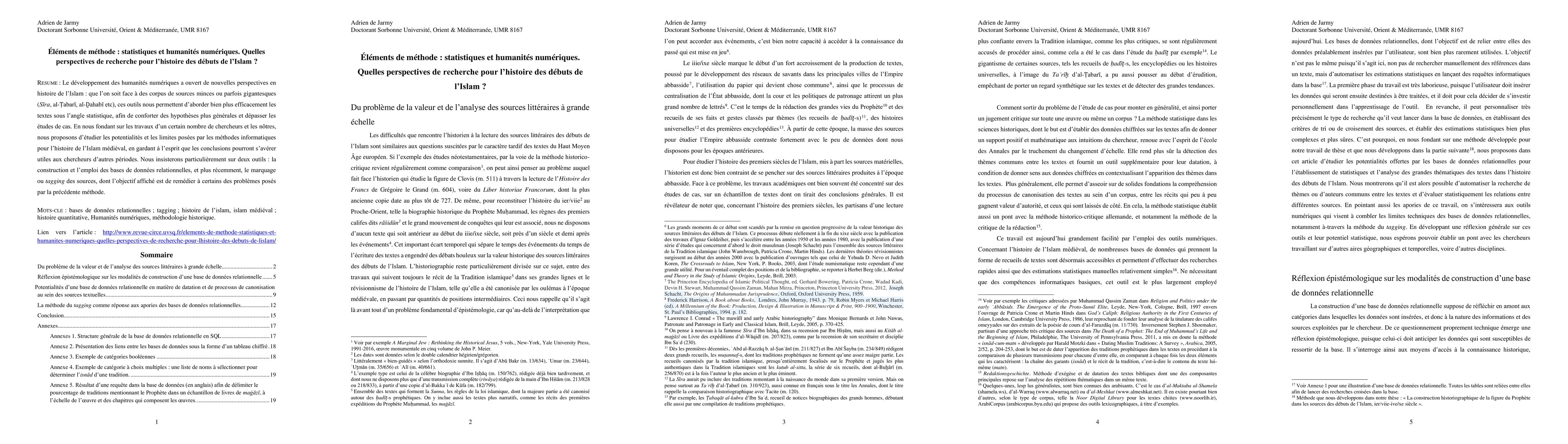 The development of digital humanities has opened new perspectives in the history of Islam: whether dealing with thin or sometimes vast source corpora (such as S\=ira, al-Tbar\=i, al-Dahab\=i, etc.), these tools allow us to approach texts much more effectively from a statistical perspective, in order to support more general hypotheses and move beyond case studies. Drawing on the work of a number of researchers as well as our own, we propose to study the potentialities and limitations posed by computer methods for the history of medieval Islam, keeping in mind that the conclusions may prove useful to researchers of other periods. We will particularly emphasize two tools: the construction and use of relational databases, and more recently, the tagging of sources, with the stated goal of addressing some of the problems posed by the previous method.