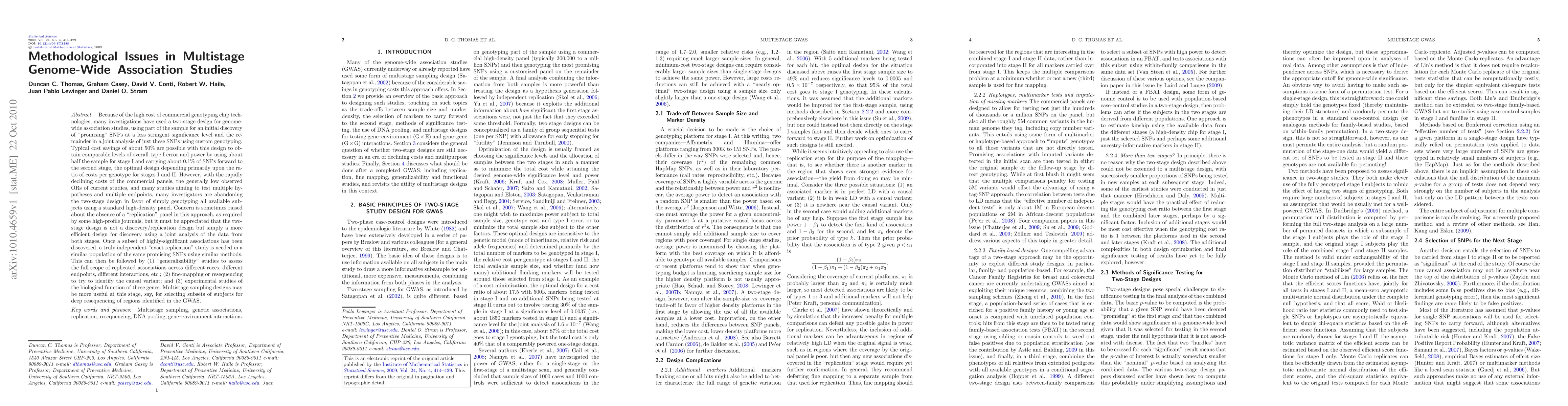 This paper discusses the methodological issues of two-stage genome-wide association studies, highlighting their cost-effectiveness and efficiency compared to single-stage designs. It notes the shift towards single-stage genotyping due to declining costs and emphasizes the need for independent replication studies to validate significant findings.