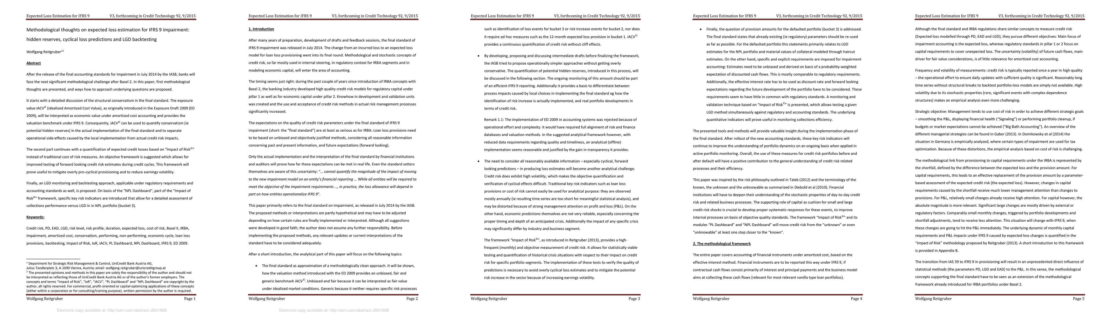 After the release of the final accounting standards for impairment in July 2014 by the IASB, banks will face the next significant methodological challenge after Basel 2. In this paper, first methodological thoughts are presented, and ways how to approach underlying questions are proposed. It starts with a detailed discussion of the structural conservatism in the final standard. The exposure value iACV(c) (idealized Amortized Cost Value), as originally introduced in the Exposure Draft 2009 (ED 2009), will be interpreted as economic value under amortized cost accounting and provides the valuation benchmark under IFRS 9. Consequently, iACV(c) can be used to quantify conservatism (ie potential hidden reserves) in the actual implementation of the final standard and to separate operational side-effects caused by the local implementation from actual credit risk impacts. The second part continues with a quantification of expected credit losses based on Impact of Risk(c) instead of traditional cost of risk measures. An objective framework is suggested which allows for improved testing of forward looking credit risk estimates during credit cycles. This framework will prove useful to mitigate overly pro-cyclical provisioning and to reduce earnings volatility. Finally, an LGD monitoring and backtesting approach, applicable under regulatory requirements and accounting standards as well, is proposed. On basis of the NPL Dashboard, part of the Impact of Risk(c) framework, specific key risk indicators are introduced that allow for a detailed assessment of collections performance versus LGD in in NPL portfolio (bucket 3).
