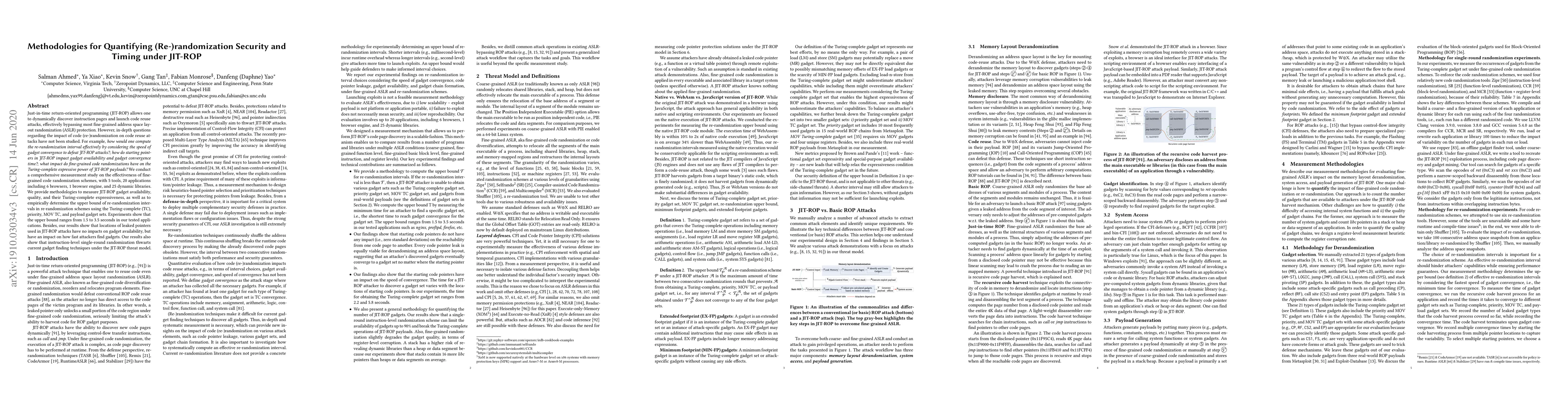 Just-in-time return-oriented programming (JIT-ROP) allows one to dynamically discover instruction pages and launch code reuse attacks, effectively bypassing most fine-grained address space layout randomization (ASLR) protection. However, in-depth questions regarding the impact of code (re-)randomization on code reuse attacks have not been studied. For example, how would one compute the re-randomization interval effectively by considering the speed of gadget convergence to defeat JIT-ROP attacks?; how do starting pointers in JIT-ROP impact gadget availability and gadget convergence time?; what impact do fine-grained code randomizations have on the Turing-complete expressive power of JIT-ROP payloads? We conduct a comprehensive measurement study on the effectiveness of fine-grained code randomization schemes, with 5 tools, 20 applications including 6 browsers, 1 browser engine, and 25 dynamic libraries. We provide methodologies to measure JIT-ROP gadget availability, quality, and their Turing-complete expressiveness, as well as to empirically determine the upper bound of re-randomization intervals in re-randomization schemes using the Turing-complete (TC), priority, MOV TC, and payload gadget sets. Experiments show that the upper bound ranges from 1.5 to 3.5 seconds in our tested applications. Besides, our results show that locations of leaked pointers used in JIT-ROP attacks have no impacts on gadget availability, but have an impact on how fast attackers find gadgets. Our results also show that instruction-level single-round randomization thwarts current gadget finding techniques under the JIT-ROP threat model.