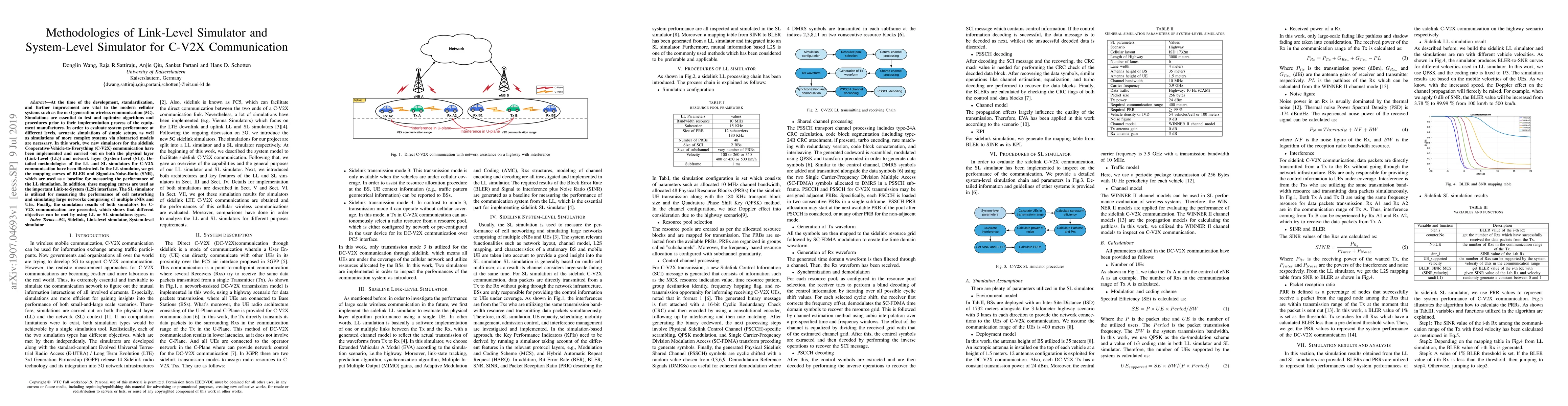 This paper presents methodologies for two new simulators—Link-Level (LL) and System-Level (SL)—for evaluating Cooperative-Vehicle-to-Everything (C-V2X) communication. The LL simulator maps BLER and SNR curves, while the SL simulator assesses cell networking and large network simulations, demonstrating the distinct objectives met by each simulation type.
