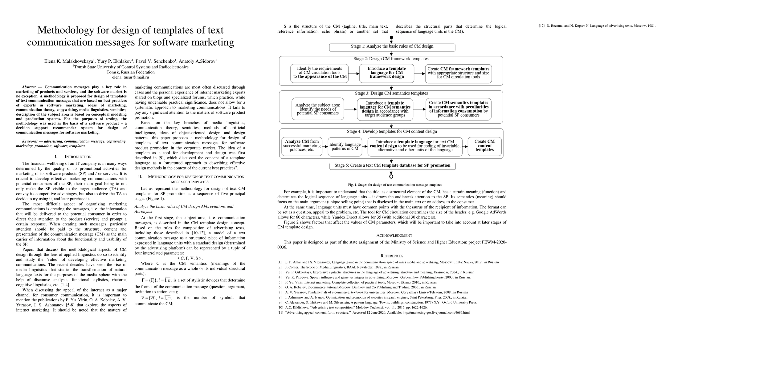 A methodology is proposed for design of templates of text communication messages that are based on best practices of experts in software marketing, ideas of marketing, communication theory, copywriting, media linguistics, semiotics. Description of the subject area is based on conceptual modeling and production systems. For the purposes of testing, the methodology was used as the basis of a software product. Decision support recommender system for design of communication messages for software marketing.