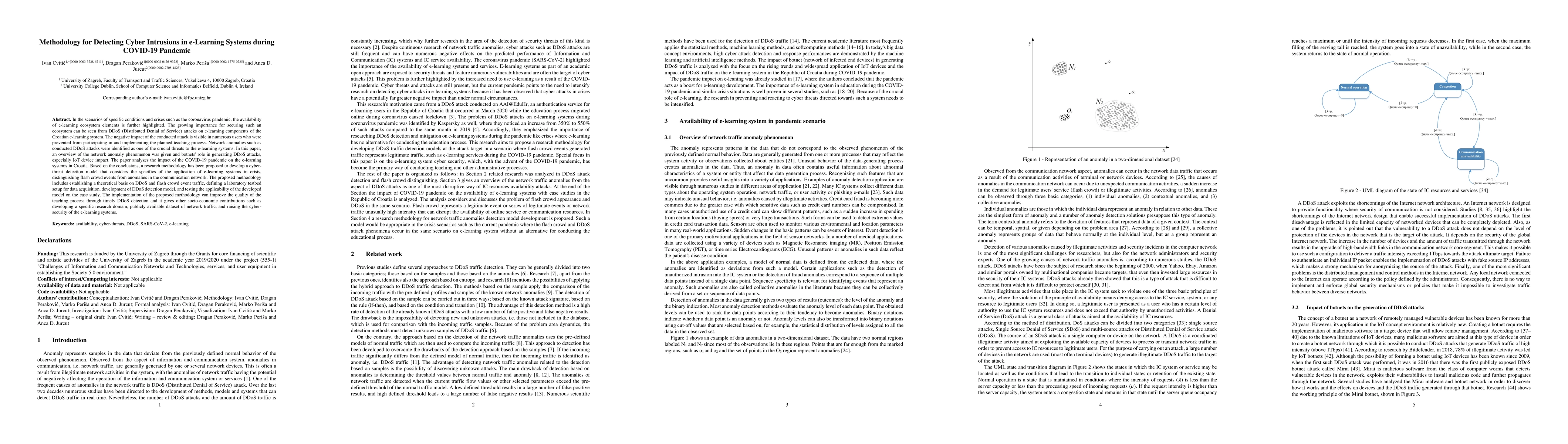 In the scenarios of specific conditions and crises such as the coronavirus pandemic, the availability of e-learning ecosystem elements is further highlighted. The growing importance for securing such an ecosystem can be seen from DDoS (Distributed Denial of Service) attacks on e-learning components of the Croatian e-learning system. The negative impact of the conducted attack is visible in numerous users who were prevented from participating in and implementing the planned teaching process. Network anomalies such as conducted DDoS attacks were identified as one of the crucial threats to the e-learning systems. In this paper, an overview of the network anomaly phenomenon was given and botnets' role in generating DDoS attacks, especially IoT device impact. The paper analyzes the impact of the COVID-19 pandemic on the e-learning systems in Croatia. Based on the conclusions, a research methodology has been proposed to develop a cyber-threat detection model that considers the specifics of the application of e-learning systems in crisis, distinguishing flash crowd events from anomalies in the communication network. The proposed methodology includes establishing a theoretical basis on DDoS and flash crowd event traffic, defining a laboratory testbed setup for data acquisition, development of DDoS detection model, and testing the applicability of the developed model on the case study. The implementation of the proposed methodology can improve the quality of the teaching process through timely DDoS detection and it gives other socio-economic contributions such as developing a specific research domain, publicly available dataset of network traffic, and raising the cyber-security of the e-learning systems.