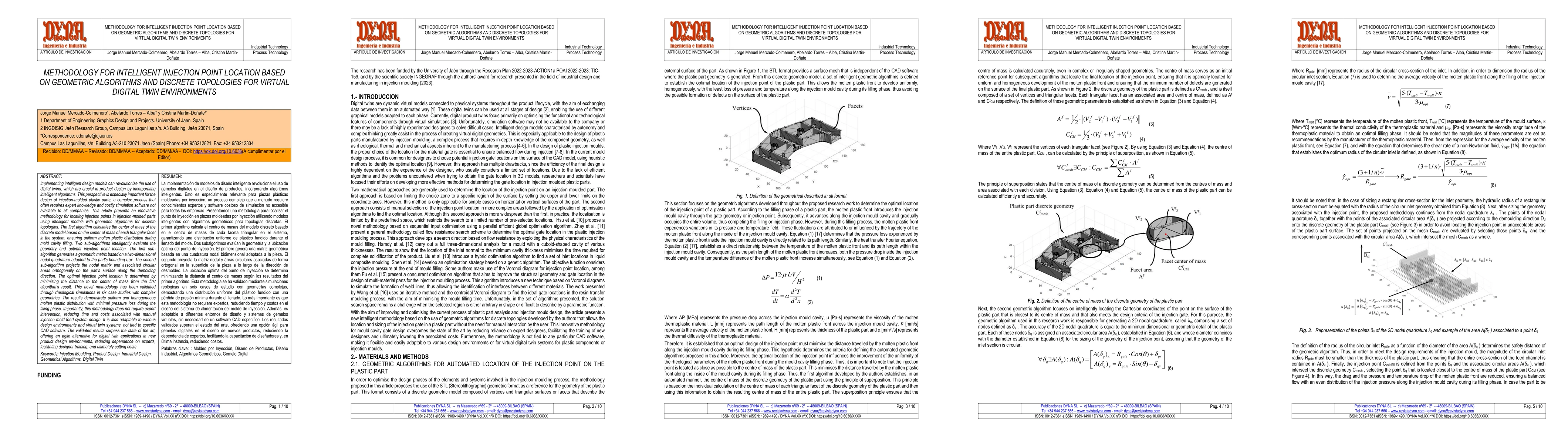 This article presents an innovative methodology for locating injection points in injection-molded parts using intelligent models with geometric algorithms for discrete topologies. The first algorithm calculates the center of mass of the discrete model based on the center of mass of each triangular facet in the system, ensuring uniform molten plastic distribution during mold cavity filling. Two sub-algorithms intelligently evaluate the geometry and optimal injection point location. The first sub-algorithm generates a geometric matrix based on a two-dimensional nodal quadrature adapted to the part's bounding box. The second sub-algorithm projects the nodal matrix and associated circular areas orthogonally on the part's surface along the demolding direction. The optimal injection point location is determined by minimizing the distance to the center of mass from the first algorithm's result. This novel methodology has been validated through rheological simulations in six case studies with complex geometries. The results demonstrate uniform and homogeneous molten plastic distribution with minimal pressure loss during the filling phase. Importantly, this methodology does not require expert intervention, reducing time and costs associated with manual injection mold feed system design. It is also adaptable to various design environments and virtual twin systems, not tied to specific CAD software. The validated results surpass the state of the art, offering an agile alternative for digital twin applications in new product design environments, reducing dependence on experts, facilitating designer training, and ultimately cutting costs