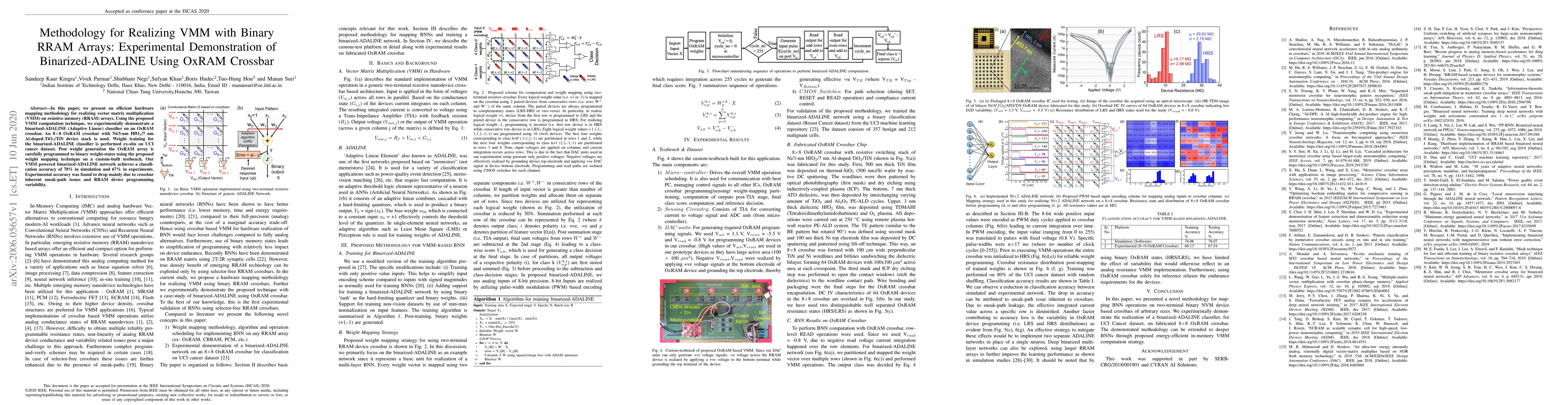 This paper proposes a hardware methodology for vector matrix multiplication on resistive memory arrays, demonstrating a binarized-ADALINE classifier using an OxRAM crossbar. The experimental setup achieved 67% classification accuracy, with lower performance attributed to sneak-path issues and device variability.