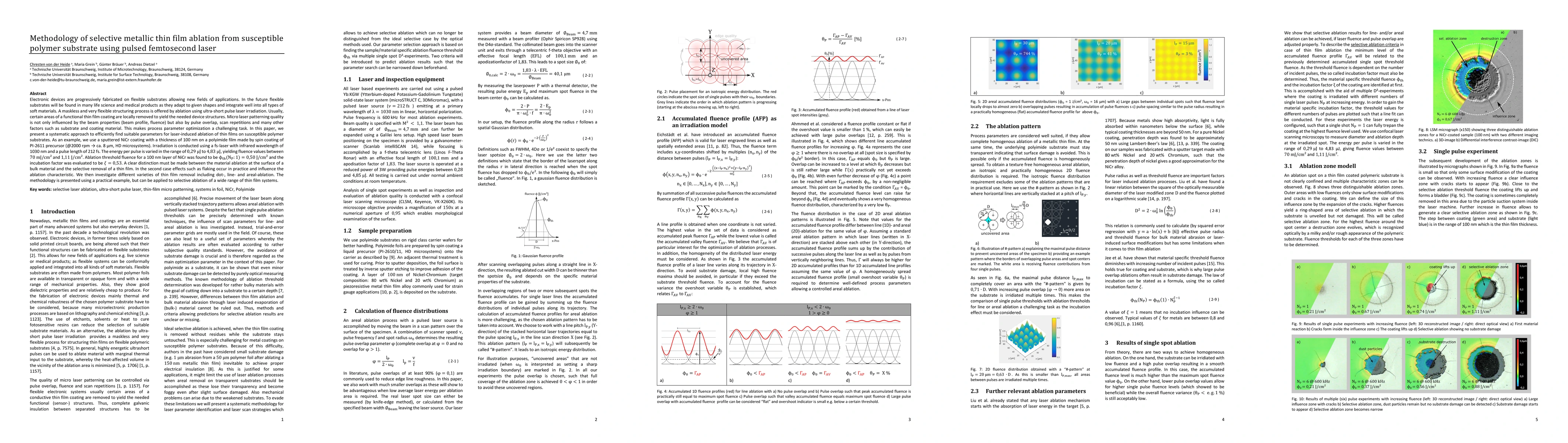 This paper presents a systematic methodology for optimizing parameters for selective ablation of metallic thin films on polymer substrates using pulsed femtosecond lasers. The study focuses on a 100 nm NiCr coating on polyimide, identifying an ablation threshold fluence of 0.50 J/cm² and evaluating the incubation factor, while demonstrating the methodology through various ablation patterns.