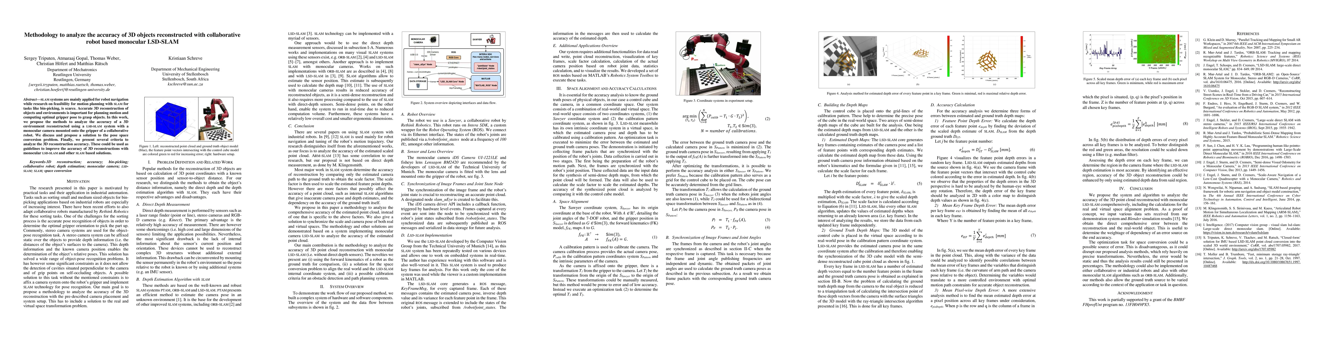 This paper proposes methods to analyze the accuracy of 3D objects reconstructed using a collaborative robot with monocular LSD-SLAM. It addresses the pose space conversion problem and presents criteria to evaluate the accuracy of 3D reconstructions, aiming to improve SLAM-based solutions for tasks like bin-picking.