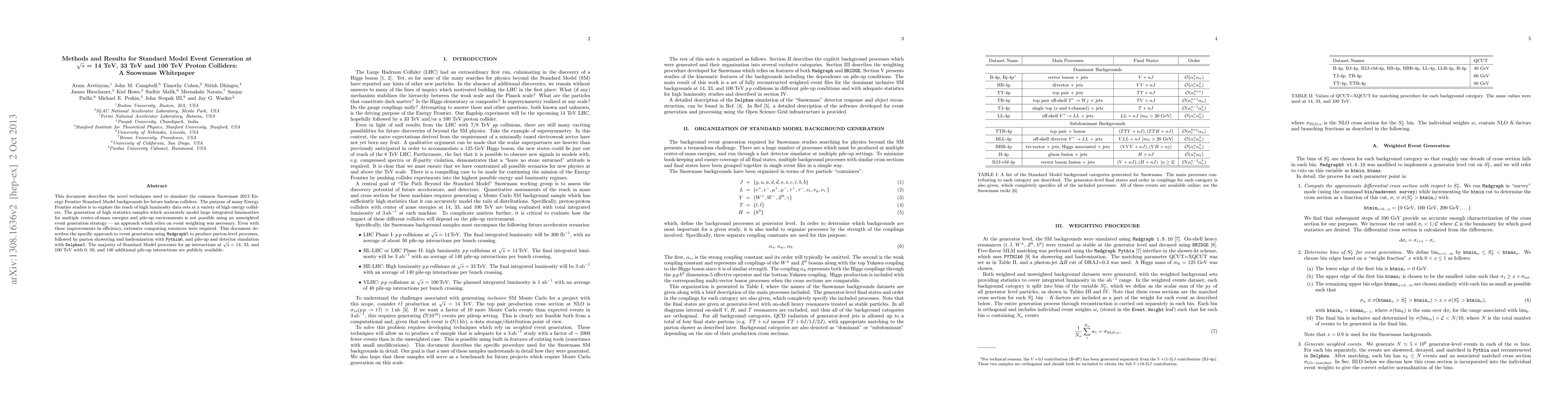 This document describes the novel techniques used to simulate the common Snowmass 2013 Energy Frontier Standard Model backgrounds for future hadron colliders. The purpose of many Energy Frontier studies is to explore the reach of high luminosity data sets at a variety of high energy colliders. The generation of high statistics samples which accurately model large integrated luminosities for multiple center-of-mass energies and pile-up environments is not possible using an unweighted event generation strategy -- an approach which relies on event weighting was necessary. Even with these improvements in efficiency, extensive computing resources were required. This document describes the specific approach to event generation using Madgraph5 to produce parton-level processes, followed by parton showering and hadronization with Pythia6, and pile-up and detector simulation with Delphes3. The majority of Standard Model processes for pp interactions at $\sqrt(s)$ = 14, 33, and 100 TeV with 0, 50, and 140 additional pile-up interactions are publicly available.