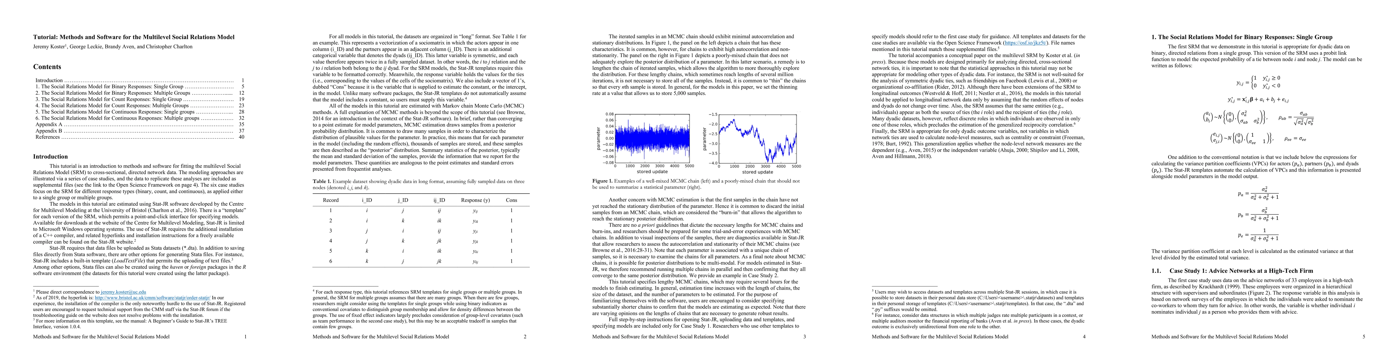 This tutorial demonstrates the estimation and interpretation of the Multilevel Social Relations Model for dyadic data, using software such as Stat-JR to analyze various outcome types and group structures.