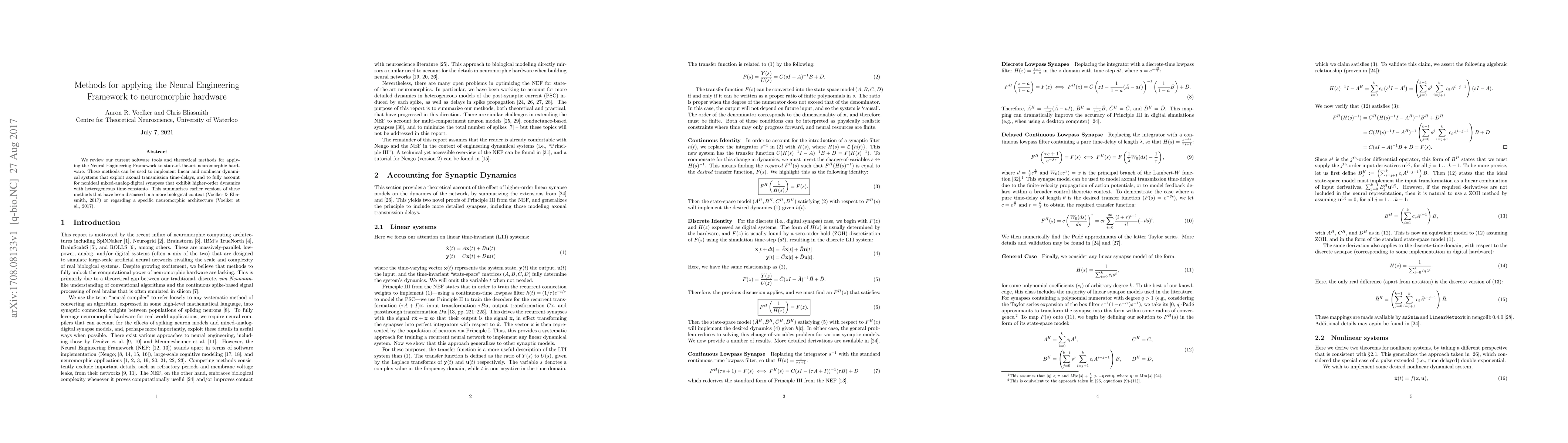 We review our current software tools and theoretical methods for applying the Neural Engineering Framework to state-of-the-art neuromorphic hardware. These methods can be used to implement linear and nonlinear dynamical systems that exploit axonal transmission time-delays, and to fully account for nonideal mixed-analog-digital synapses that exhibit higher-order dynamics with heterogeneous time-constants. This summarizes earlier versions of these methods that have been discussed in a more biological context (Voelker & Eliasmith, 2017) or regarding a specific neuromorphic architecture (Voelker et al., 2017).