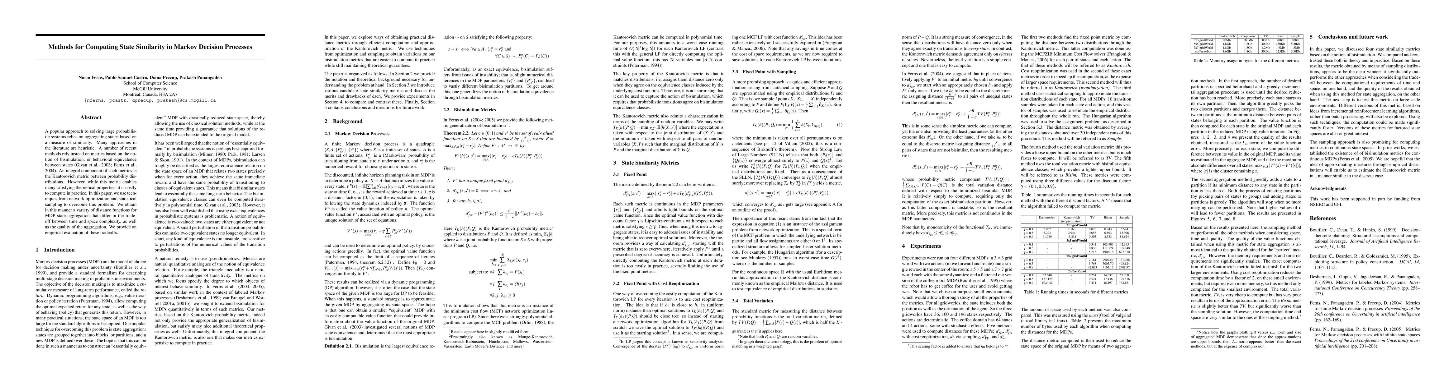 A popular approach to solving large probabilistic systems relies on aggregating states based on a measure of similarity. Many approaches in the literature are heuristic. A number of recent methods rely instead on metrics based on the notion of bisimulation, or behavioral equivalence between states (Givan et al, 2001, 2003; Ferns et al, 2004). An integral component of such metrics is the Kantorovich metric between probability distributions. However, while this metric enables many satisfying theoretical properties, it is costly to compute in practice. In this paper, we use techniques from network optimization and statistical sampling to overcome this problem. We obtain in this manner a variety of distance functions for MDP state aggregation, which differ in the tradeoff between time and space complexity, as well as the quality of the aggregation. We provide an empirical evaluation of these trade-offs.