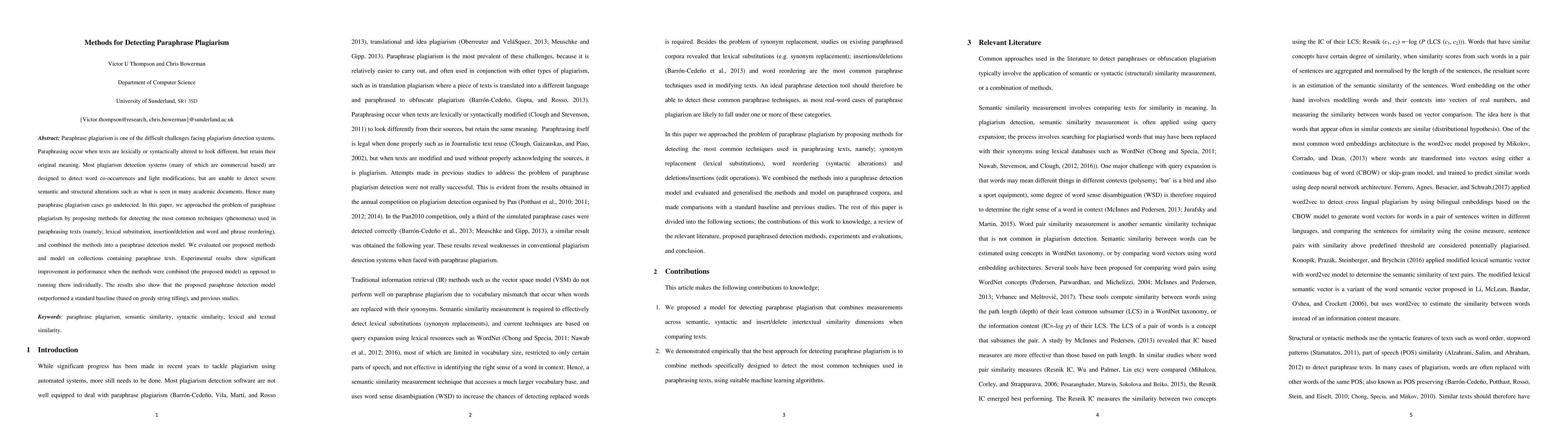 This paper proposes advanced methods for detecting paraphrase plagiarism by identifying common paraphrasing techniques such as lexical substitution, insertion/deletion, and reordering. The combined model significantly outperforms individual methods and a standard baseline, demonstrating improved performance in detecting severe semantic and structural alterations.