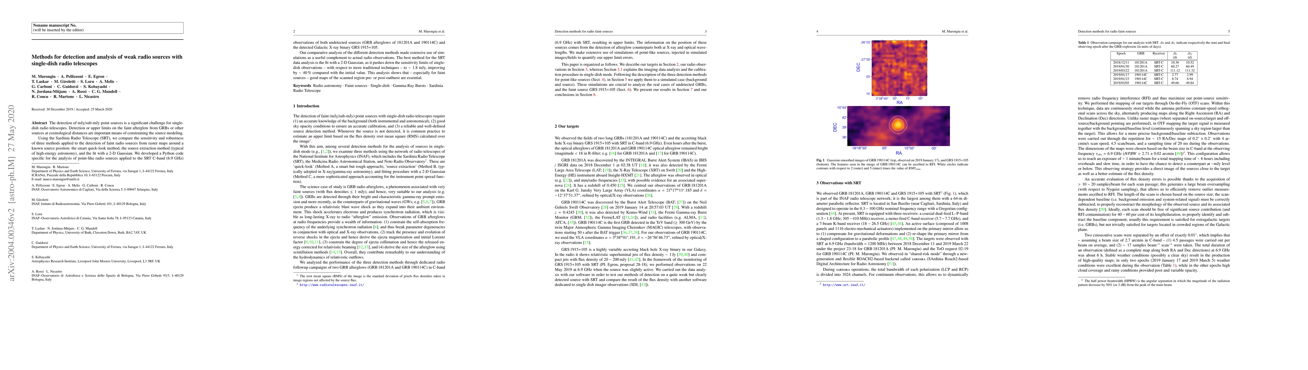 This paper compares three methods for detecting weak radio sources using the Sardinia Radio Telescope, finding that fitting with a 2-D Gaussian improves sensitivity by ~40% to ~1.8 mJy. The study emphasizes the importance of pre- or post-outburst maps for faint sources.