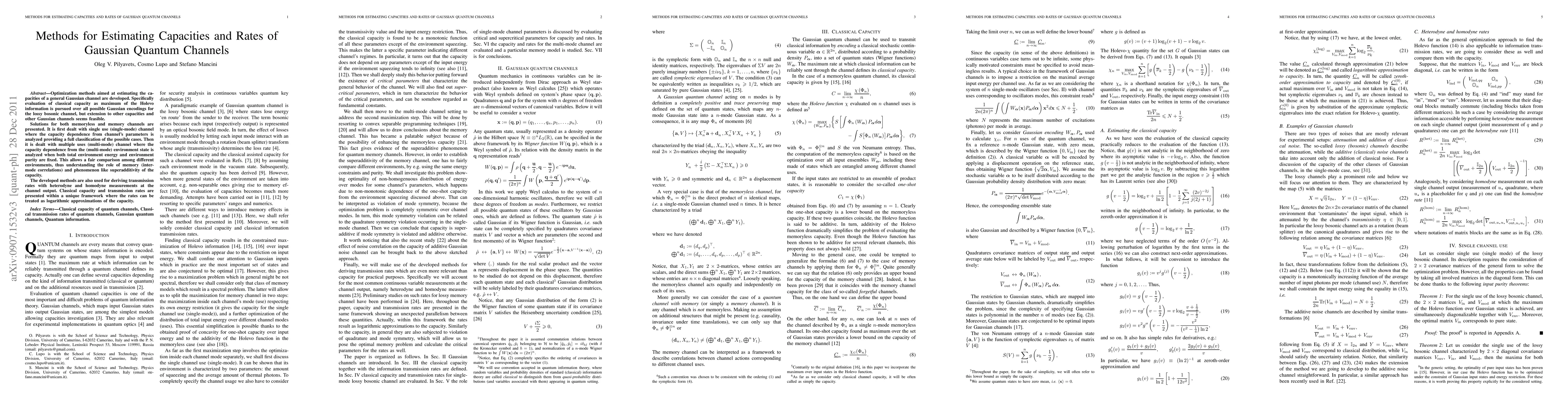 This paper develops optimization methods for estimating the capacities of Gaussian quantum channels, focusing on classical capacity via Holevo information over Gaussian encodings. It classifies capacities for both single-use and multiple-use channels, exploring the impact of memory and inter-mode correlations, and derives transmission rates for heterodyne and homodyne measurements.