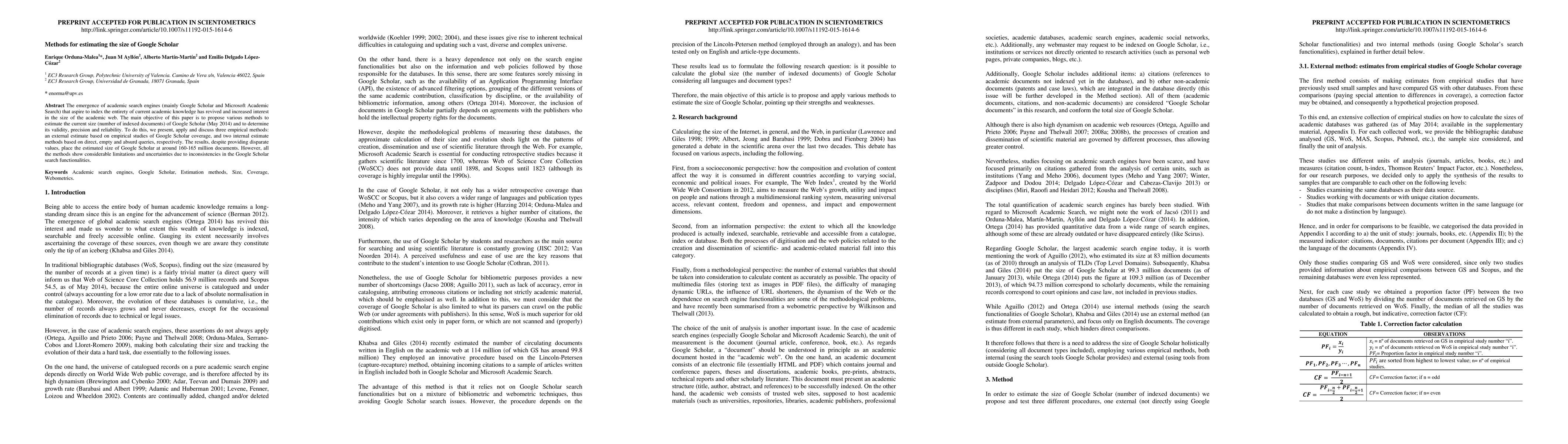 This paper proposes three methods to estimate the size of Google Scholar in 2014, finding it to be around 160 to 165 million documents. However, the methods reveal significant limitations and uncertainties due to inconsistencies in Google Scholar's search functionalities.