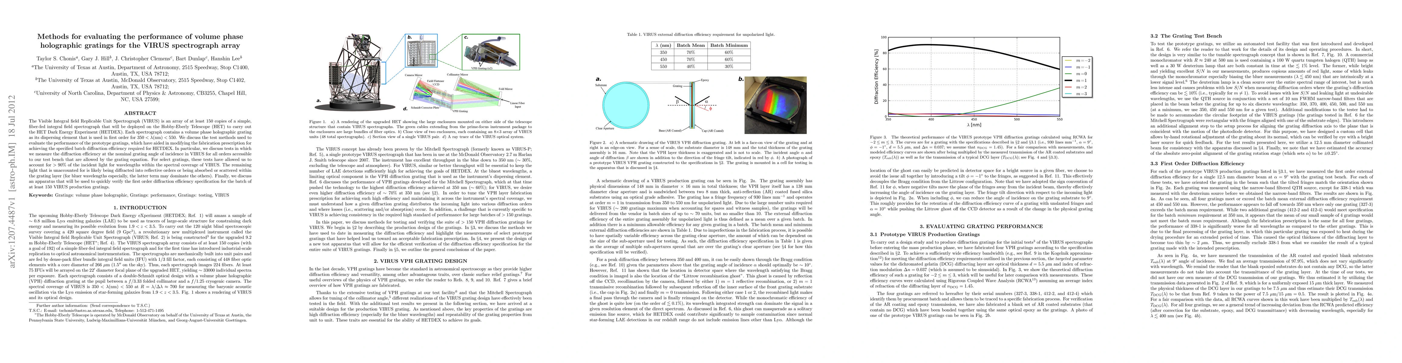 This paper evaluates the performance of volume phase holographic gratings used in the VIRUS spectrograph array for the HET Dark Energy Experiment. It details test methods to measure diffraction efficiency, achieving high efficiency for most wavelengths, and discusses an apparatus for verifying production gratings.